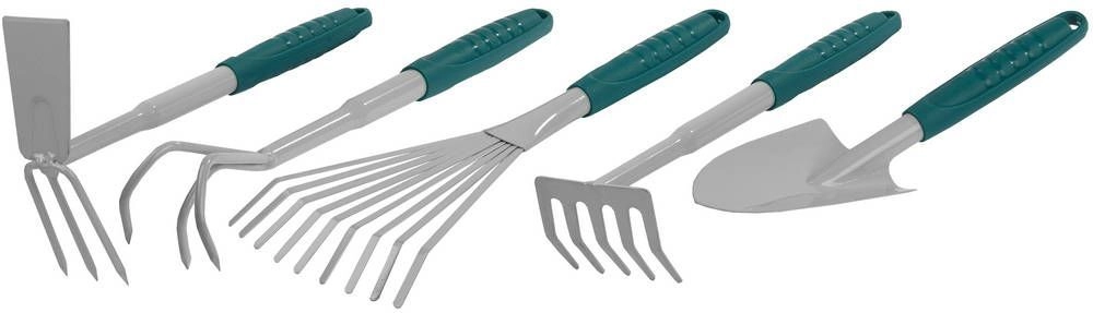 В комплект вошли: мотыжка, совок широкий, грабельки, рыхлитель садовый, грабельки веерные.