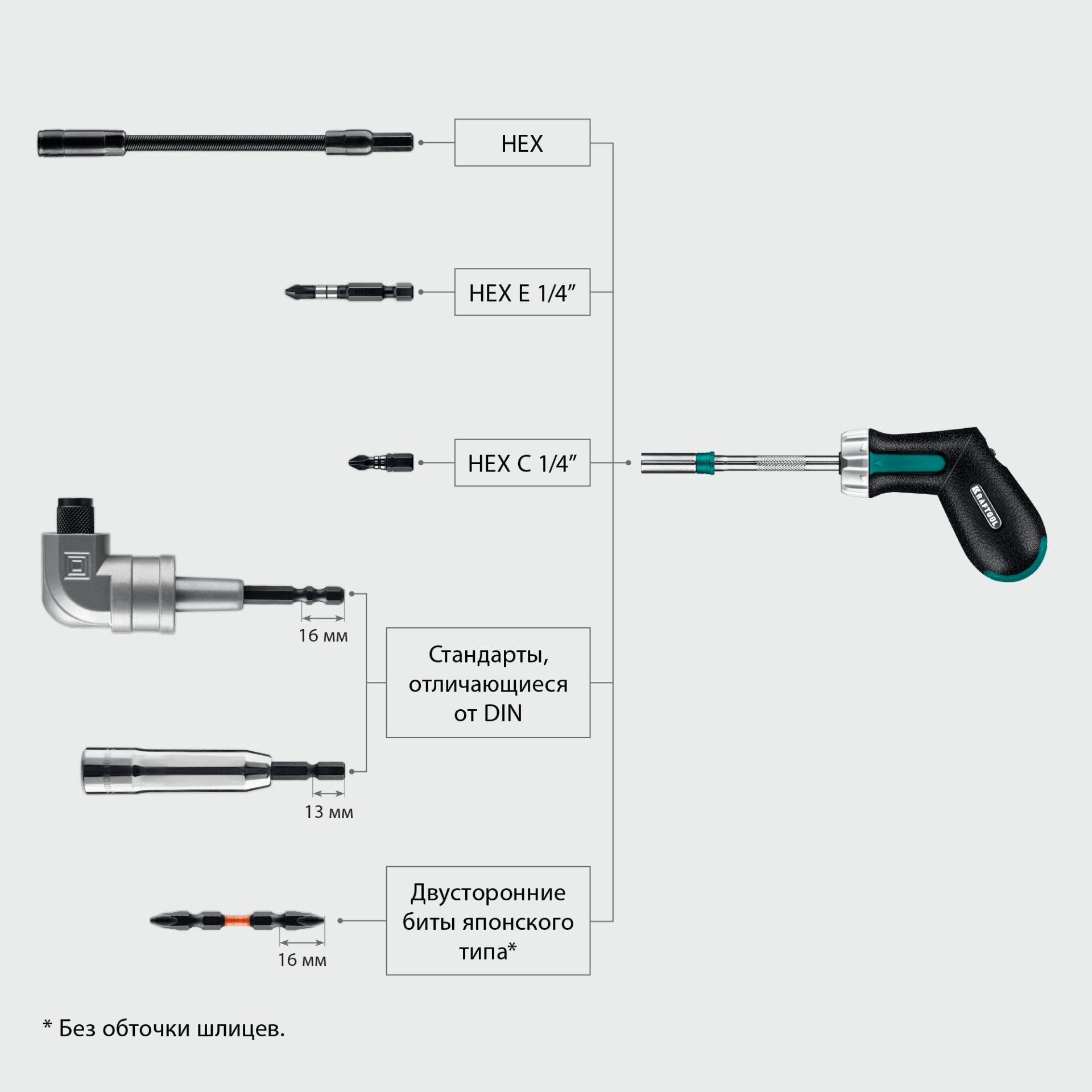 - SLIM body - встроенный держатель бит для мест с ограниченным доступом.