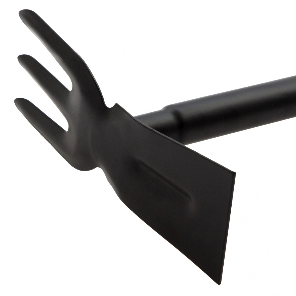 Полотно мотыжки совмещено с рыхлителем, поэтому она удобна при вскапывании и рыхлении почвы в труднодоступных местах.