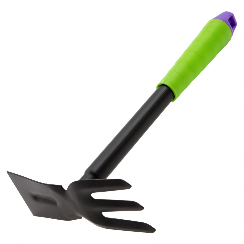 Полотно мотыжки совмещено с рыхлителем, поэтому она удобна при вскапывании и рыхлении почвы в труднодоступных местах.