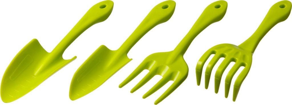 ПроизводителиНабор садовый пластиковый, 4 предмета: Вилка, грабельки, 2 совка (421429-H4) РОСТОК