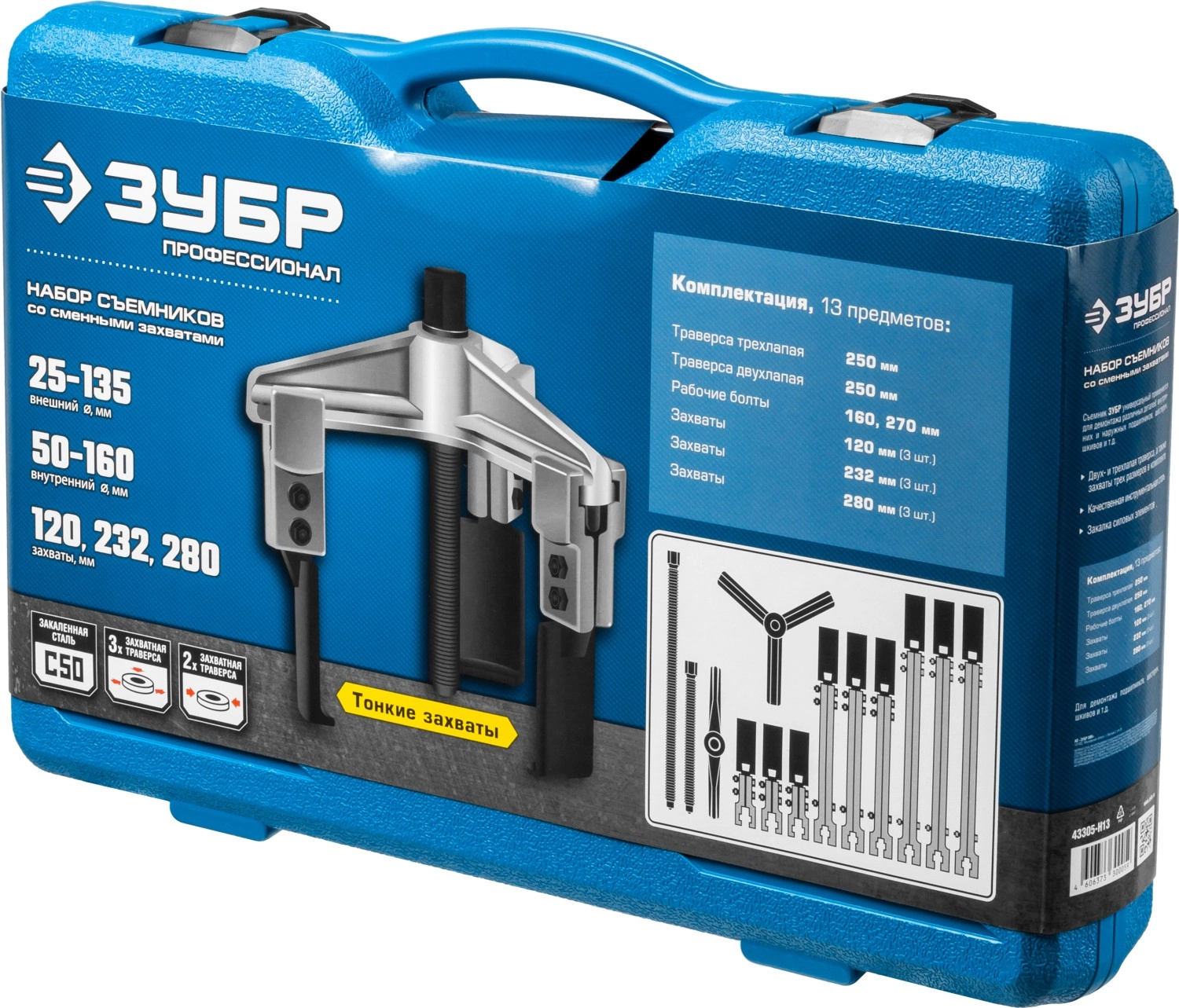 ПроизводителиНабор съемников со сменными захватами, Профессионал 43305-H13, в кейсе (43305-H13) ЗУБР