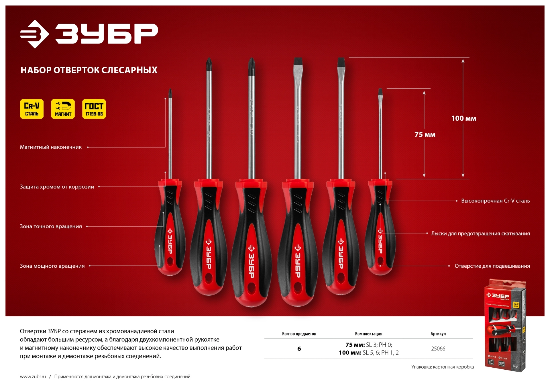 ХарактеристикиАртикул 25066Бренды ЗубрСтрана производства КитайТип изделия набор отвертокВес 0.44Отвертки «ЗУБР» разработаны в соответствии с высокими требованиями профессионалов. Выдерживают высокие нагрузки благодаря высококачественной хромомолибденовой стали стали, закаленной по особой технологии. Имеют большой ресурс, обеспечивают высокое качество выполнения работ при монтаже и демонтаже резьбовых соединений