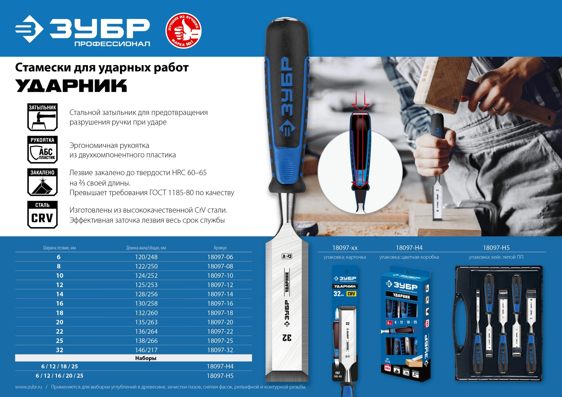 ПроизводителиНабор стамесок с двухкомпонентными ручками, 6/12/16/20/25мм, 5шт. (18097-H5) ЗУБР