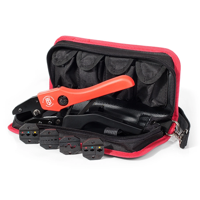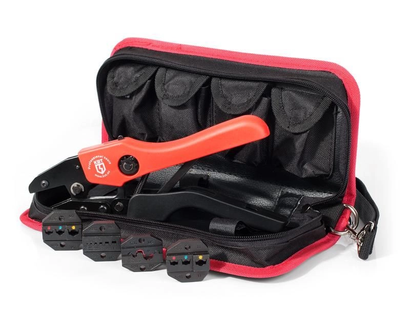 Набор СТК+4 Пресс-клещи с наборами матриц в прочной тканевой сумке, КВТ 75907 — набор предназначен для опрессовки изолированных наконечников, гильз и разъемов, втулочных наконечников, неизолированных медных наконечников