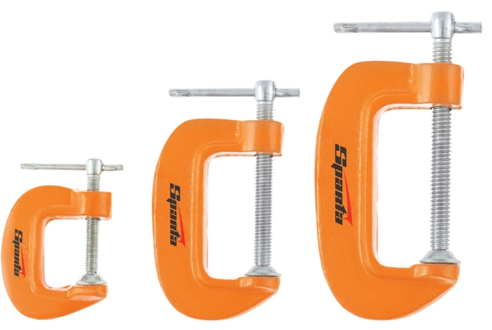 Набор Sparta 206755 включает 3 G-образные струбцины с шириной зажима 25, 50 и 75 мм.