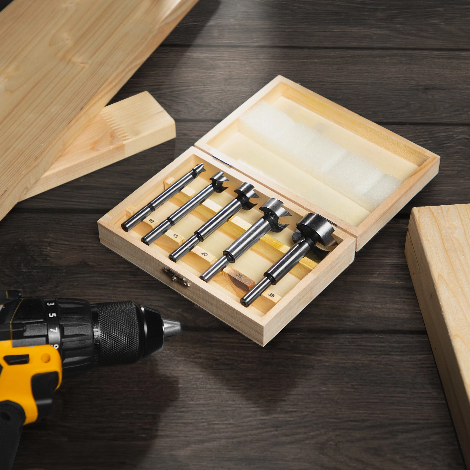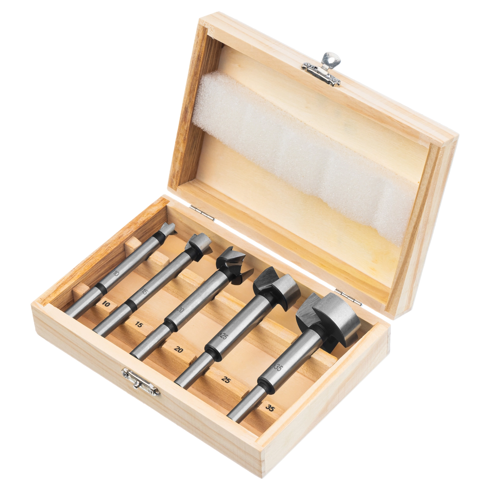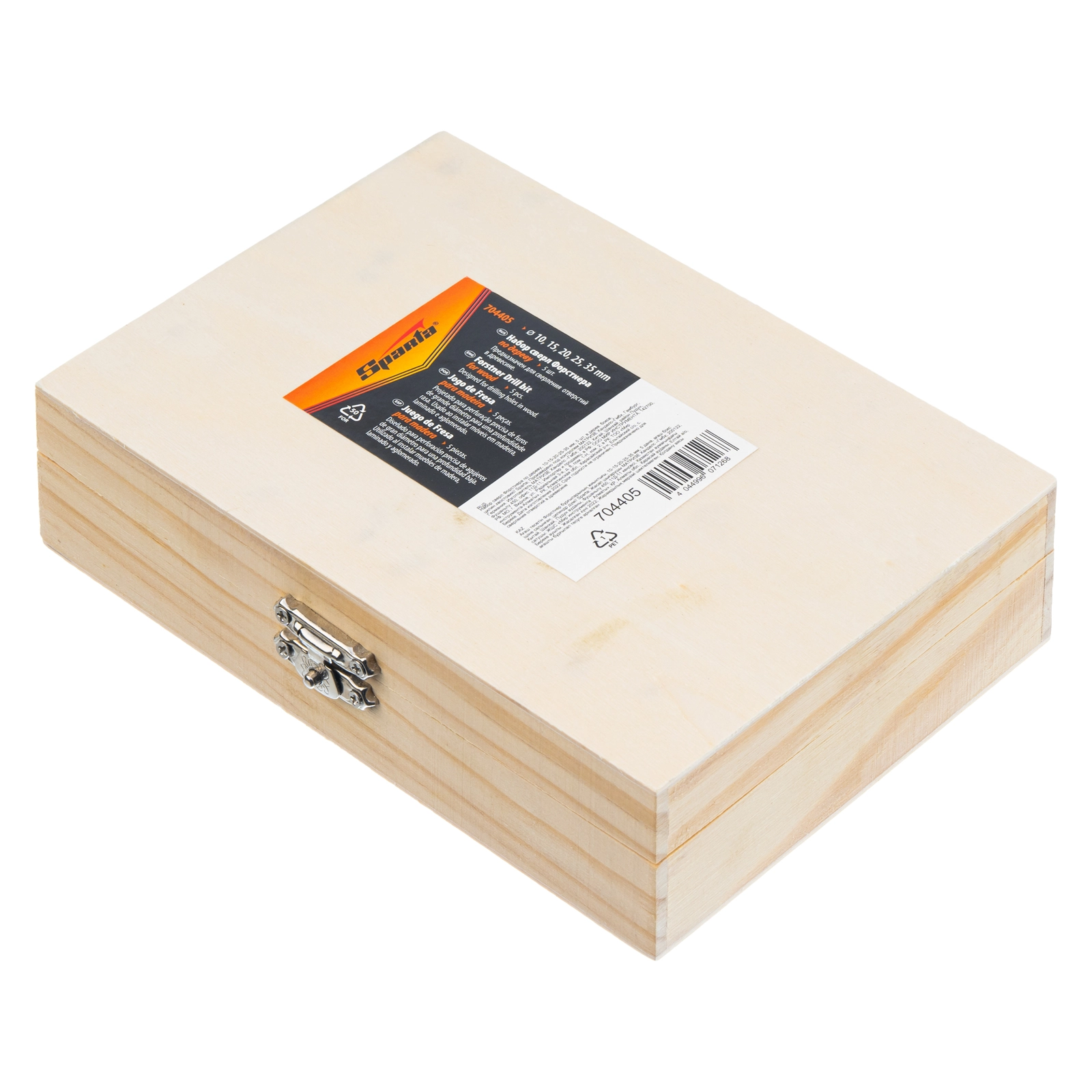 Набор сверл Форстнера по дереву Sparta 704405 включает 5 сверл размером 10-15-20-25-35 мм с цилиндрическими хвостовиками, упакованных в деревянный бокс.