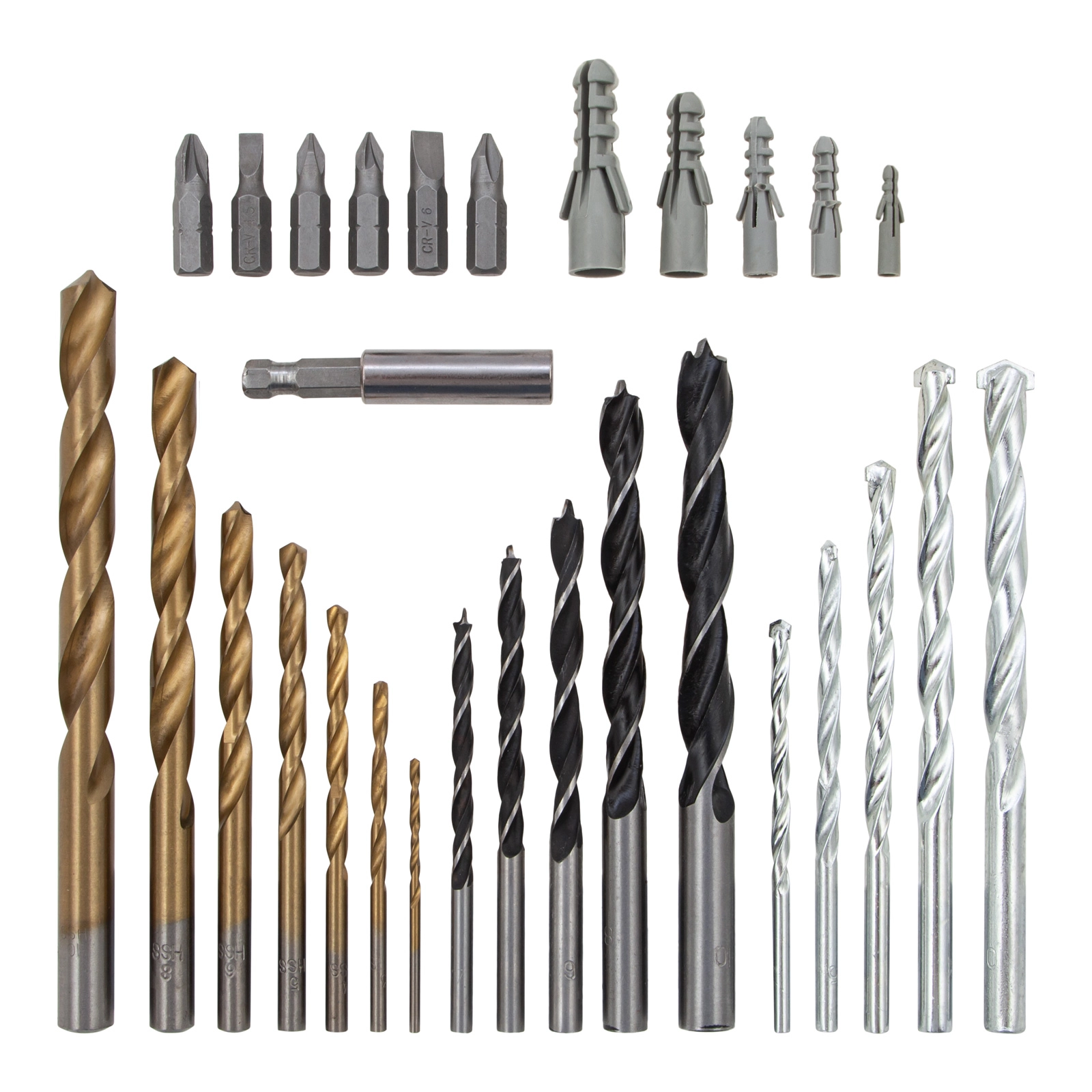 Качественное исполнение и высокий ресурс — биты выполнены из стали 45Х, сверла по дереву — из углеродистой стали, а сверла по металлу — из быстрорежущей стали HSS.