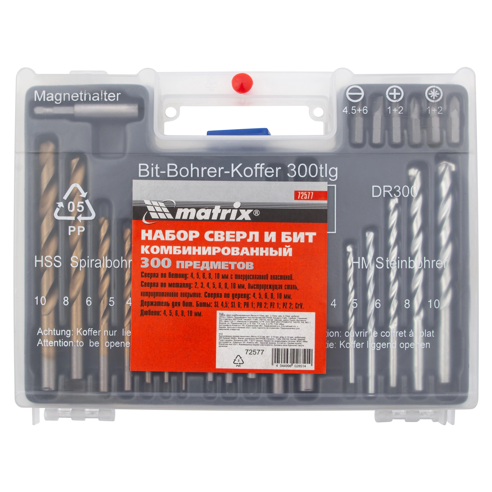 Комбинированный набор Matrix PRO 72577 — это универсальное решение для мастеров, т.к. он содержит 300 предметов: отверточные биты, сверла по дереву 4-10 мм, сверла по бетону 4-10 мм и сверла металлу 2-10 мм.