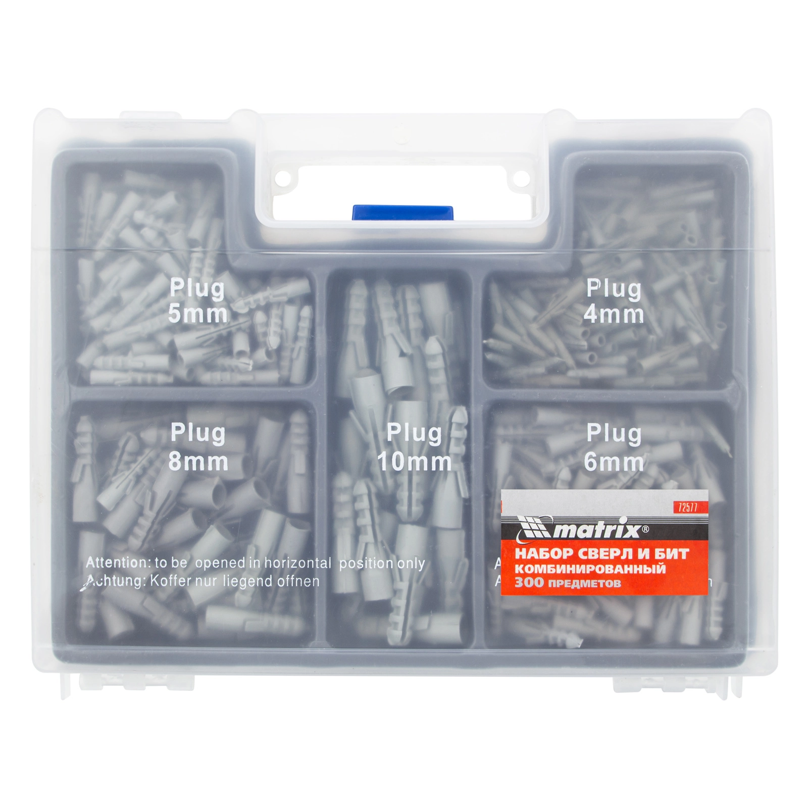 ПроизводителиНабор сверл комбинированный (бетон 4-10мм, мет. 2-10мм, дер. 4-10мм, дюбеля) 300пр. (72577) MATRIX