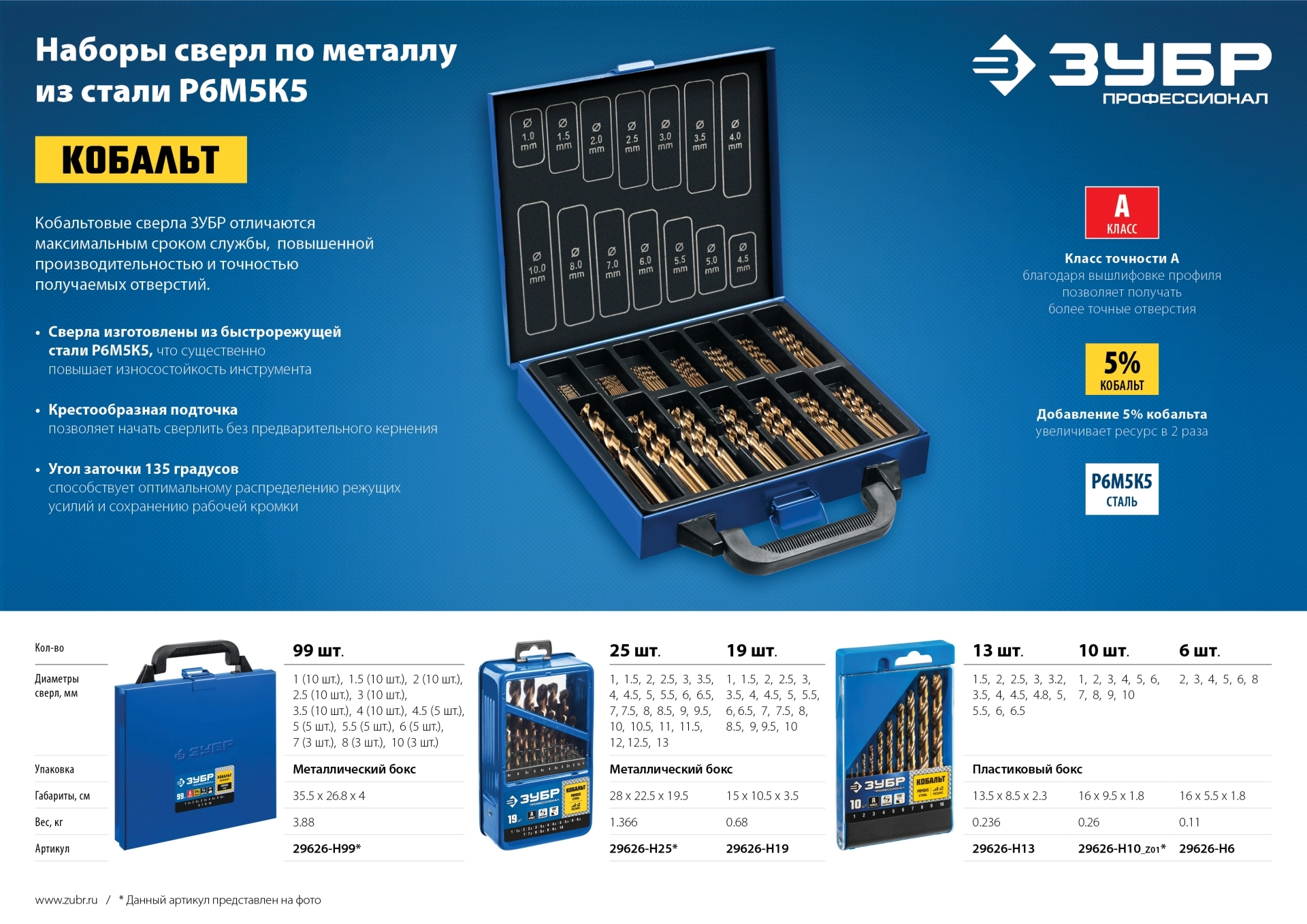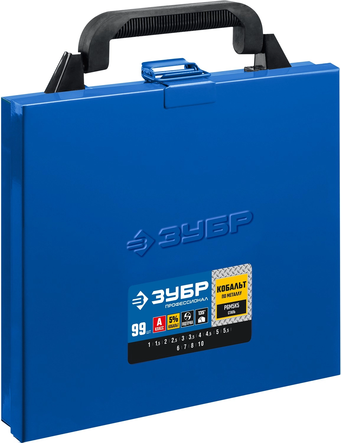 ПроизводителиНабор сверл по металлу 1.0-10.0 мм, HSS-Co, 99шт., класс А "Профессионал" (29626-H99) ЗУБР