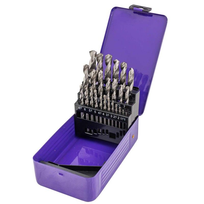 Сверло изготовлено из высококачественной быстрорежущей стали HSS, которая обеспечивает высокую стойкость, выдающуюся скорость сверления, отличается простым и точным центрированием и длительным сроком службы. Набор включает в себя 25 сверл, которые имеют диаметр от 1 до 13 мм с шагом 0,5 мм.