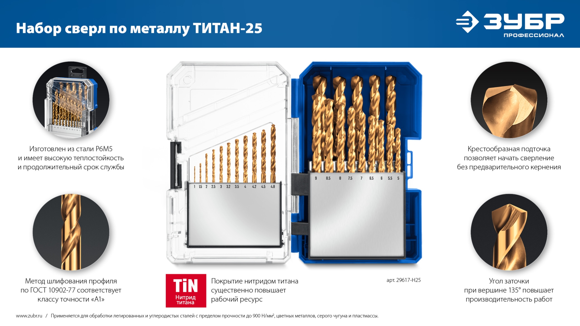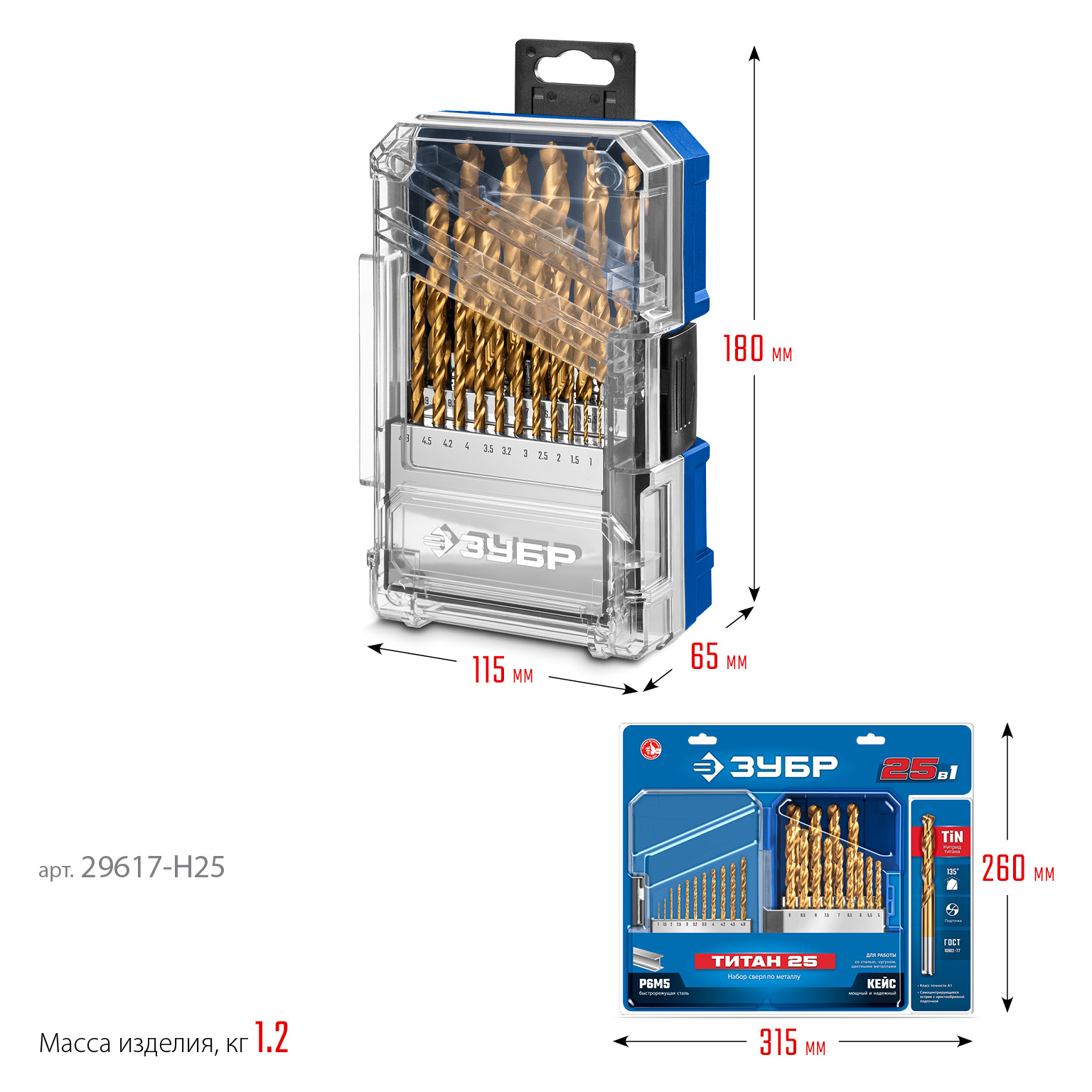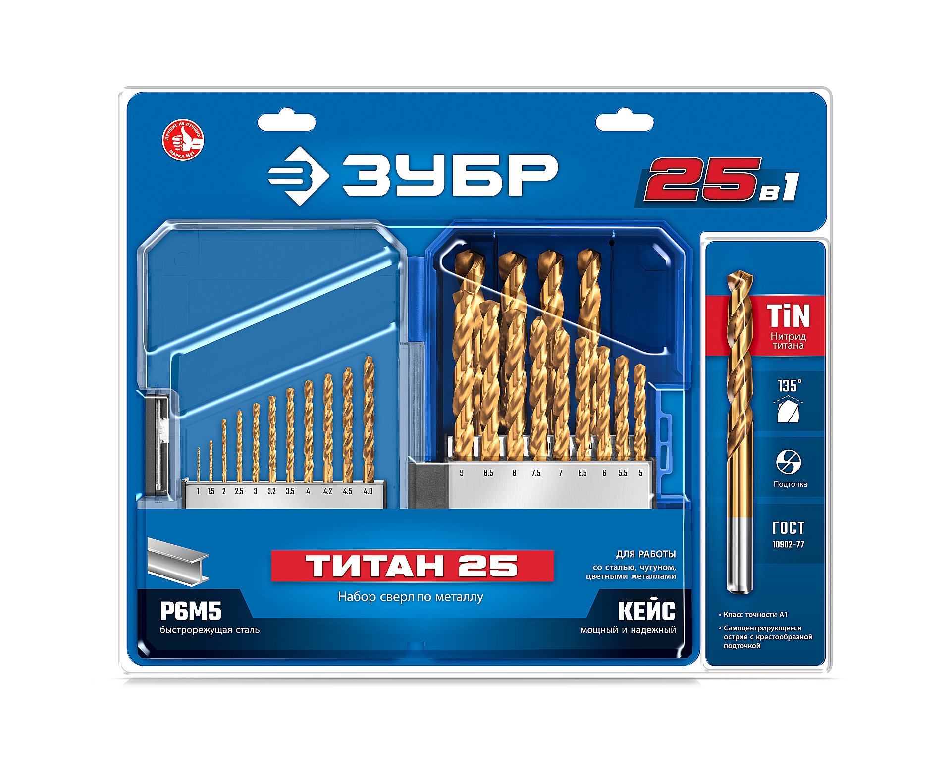 ПроизводителиНабор сверл по металлу 1.0-13.0 мм, HSS-TiN, 25шт., класс А "ТИТАН" (29617-H25) ЗУБР
