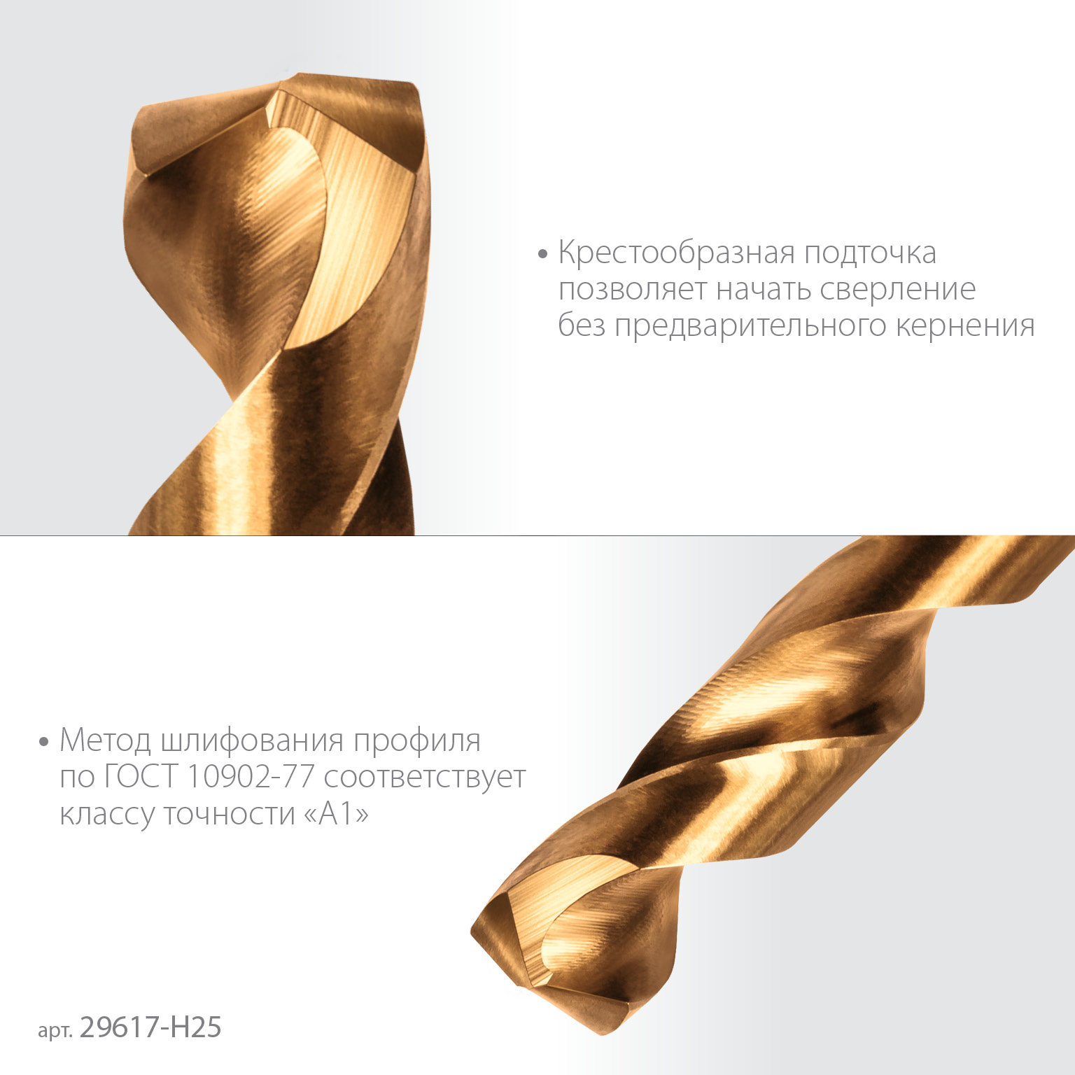 Сверла по металлу в наборе ЗУБР 29617-H25, предназначены для обработки загатовок из стали, чугуна и цветных металлов. Изготовлены из стали Р6М5 и имеет высокую теплостойкость и продолжительный срок службы. Класс точности А1. Самоцентрирующееся острие с крестообразной подточкой.