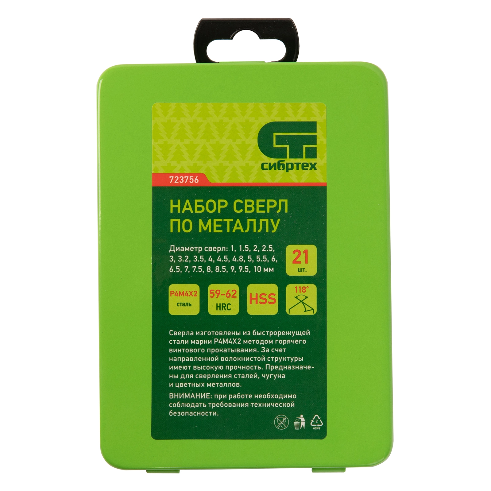 ПроизводителиНабор сверл по металлу, 1-10 мм (через 0,5 мм,3.2,4.8 мм), HSS, 21шт, мет.бокс (723756) СИБРТЕХ