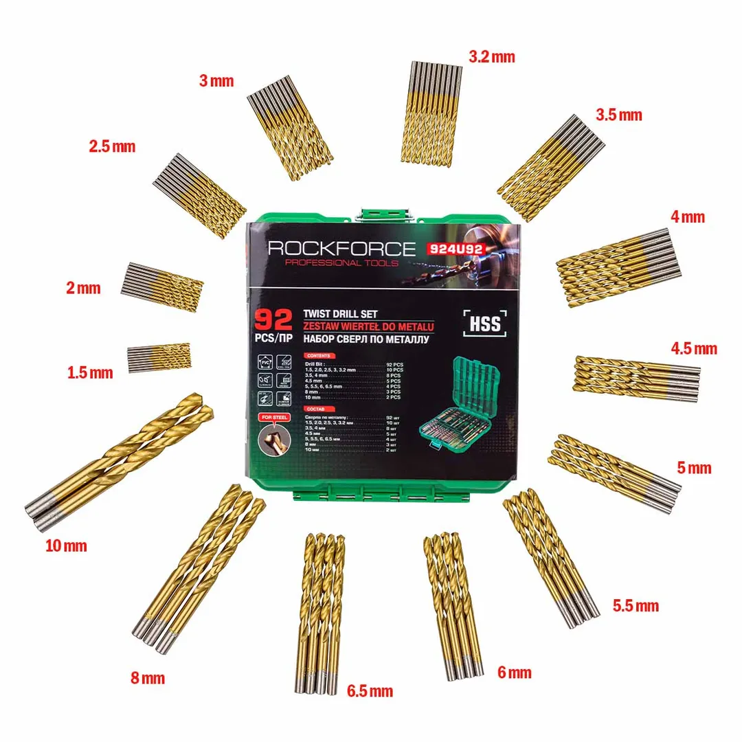 Набор сверл по металлу HSS 92 предмета от бренда Rockforce - это набор спиральных свёрл, предназначенных для сверления отверстий в металлических изделиях. В наборе 92 предмета.