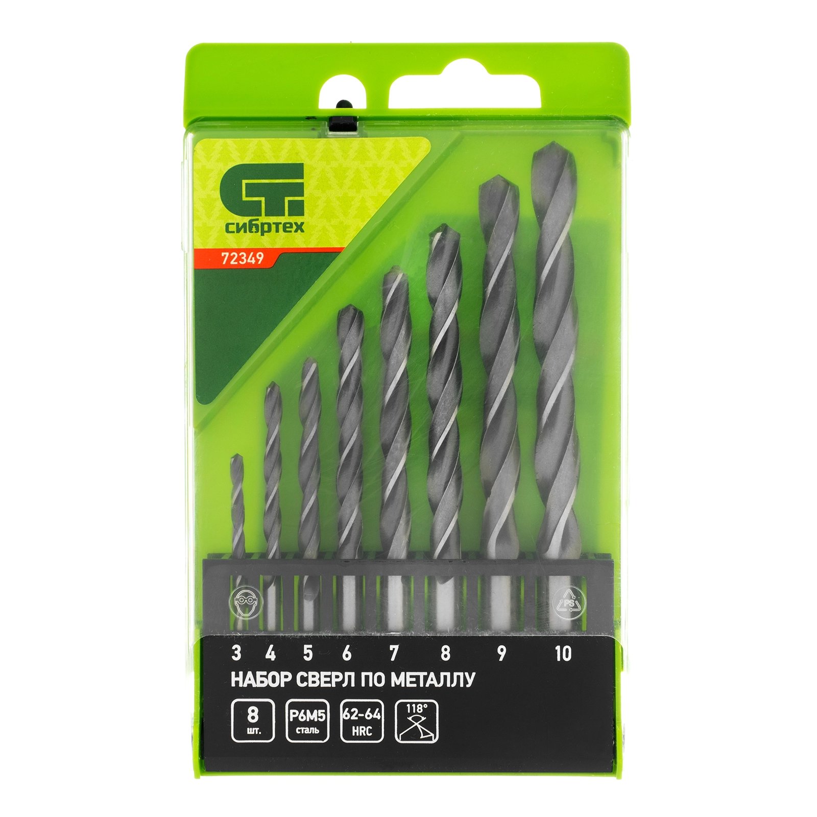 ПроизводителиНабор сверл по металлу, 3-10 мм, 8 шт., Р6М5, пластиковый кейс (72349) СИБРТЕХ