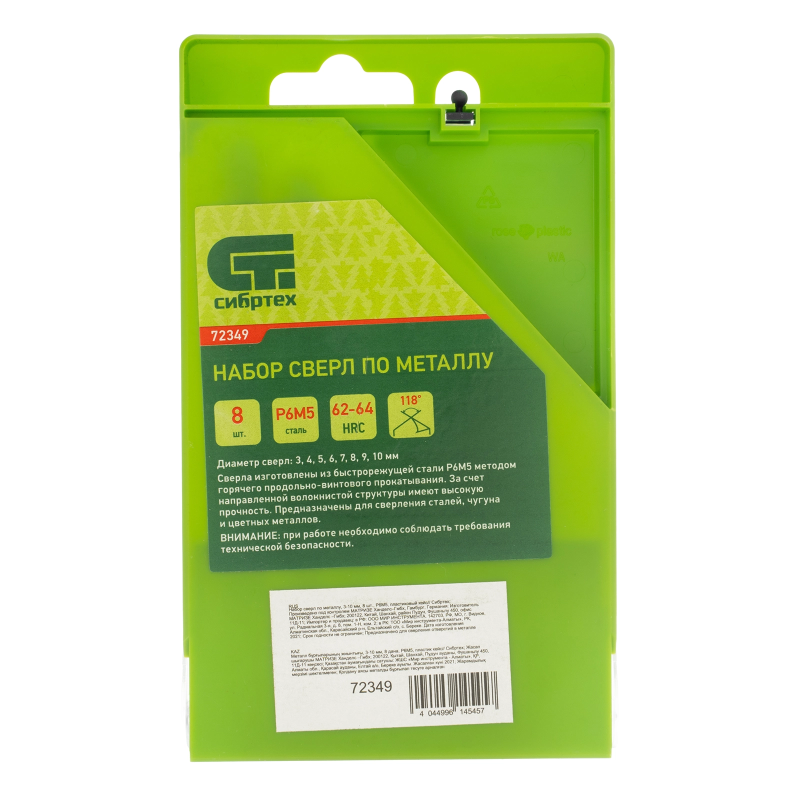Набор сверл по металлу Сибртех 72349 включает 8 инструментов из стали P6M5, упакованных в пластиковый кейс, и предназначен для получения отверстий диаметром 3-10 мм.