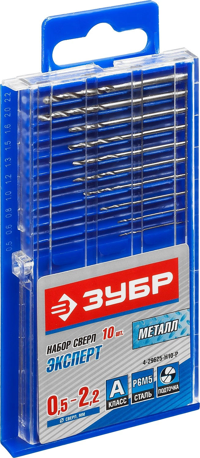 ПроизводителиНабор сверл по металлу 0.5-2.2 мм, HSS, 10шт., класс А, "Проф-А" (29625-H10-P) ЗУБР