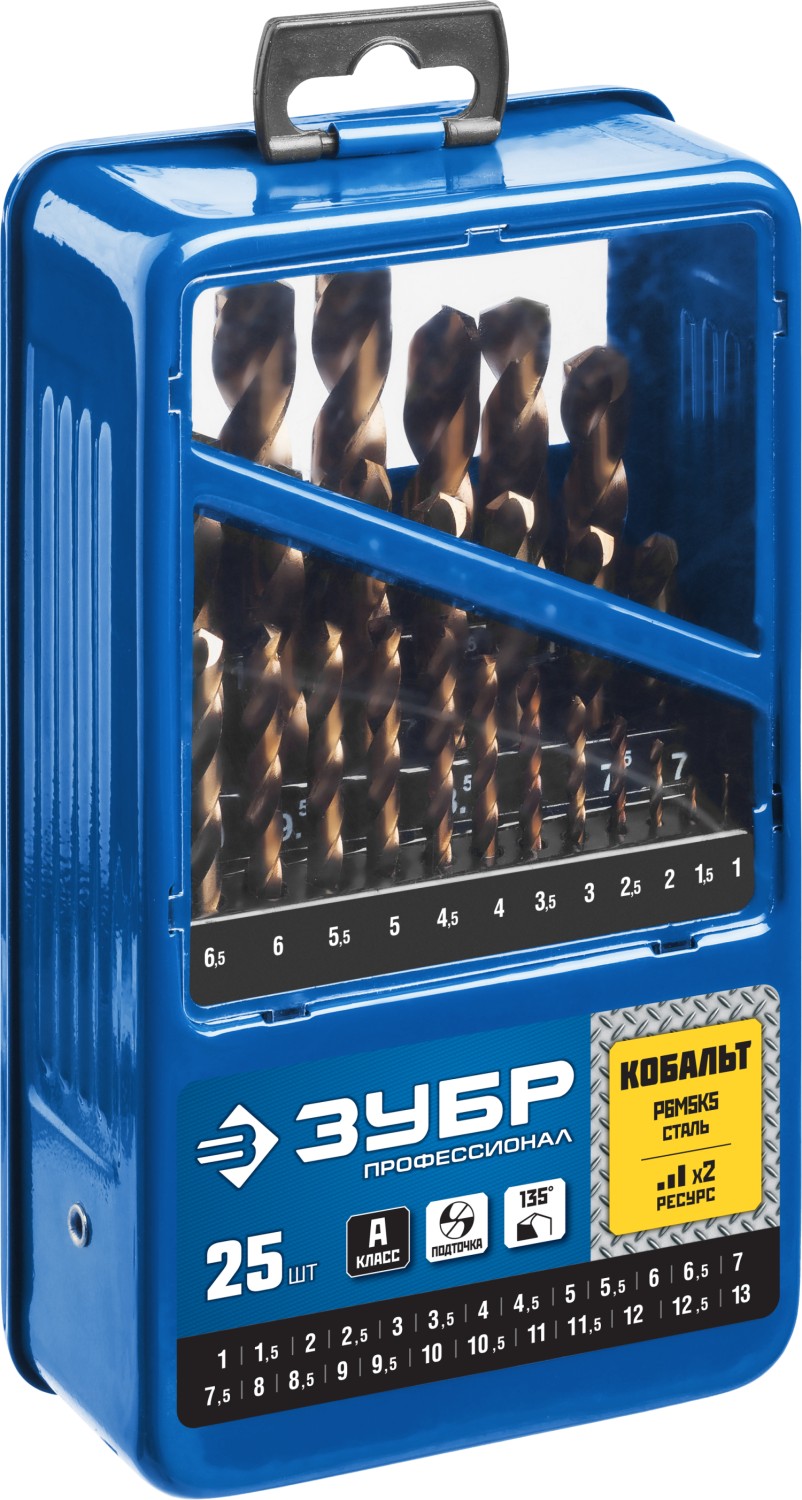 ПроизводителиНабор сверл по металлу 1.0-13.0 мм, HSS-Co, 25шт., класс А "Профессионал" (29626-H25) ЗУБР