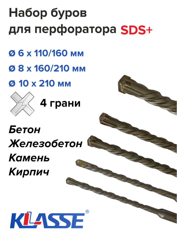 ПроизводителиНабор сверл SDS-plus №2, 5 шт.: 6, 8, 10мм, общ. длина 110-210мм (KL03113-2) KLASSE