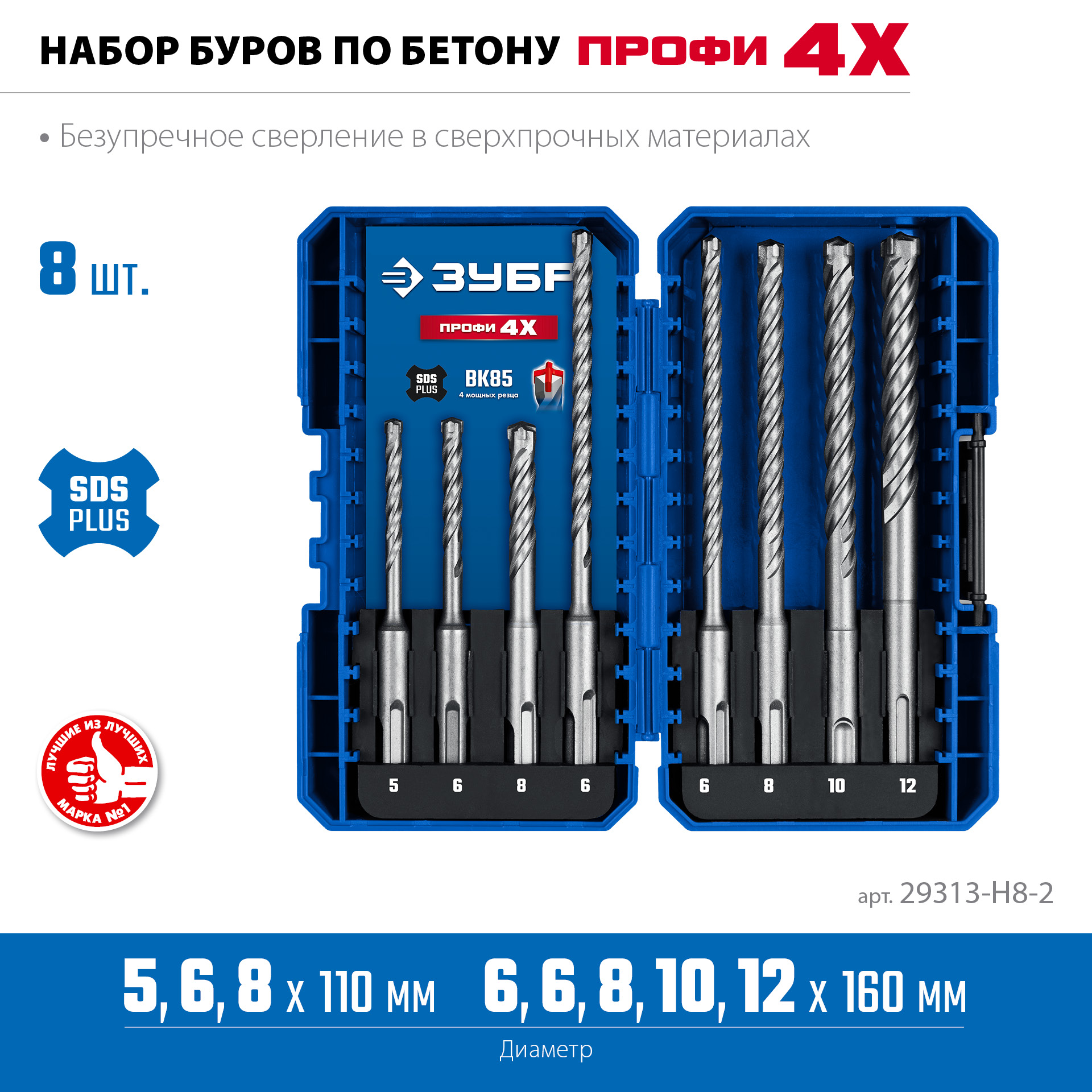 ПроизводителиНабор сверл SDS-plus, 8шт., квадро: 5,6,8х110; 6,8х160; 10,12х160мм "ПРОФИ-4Х" (29313-H8-2) ЗУБР