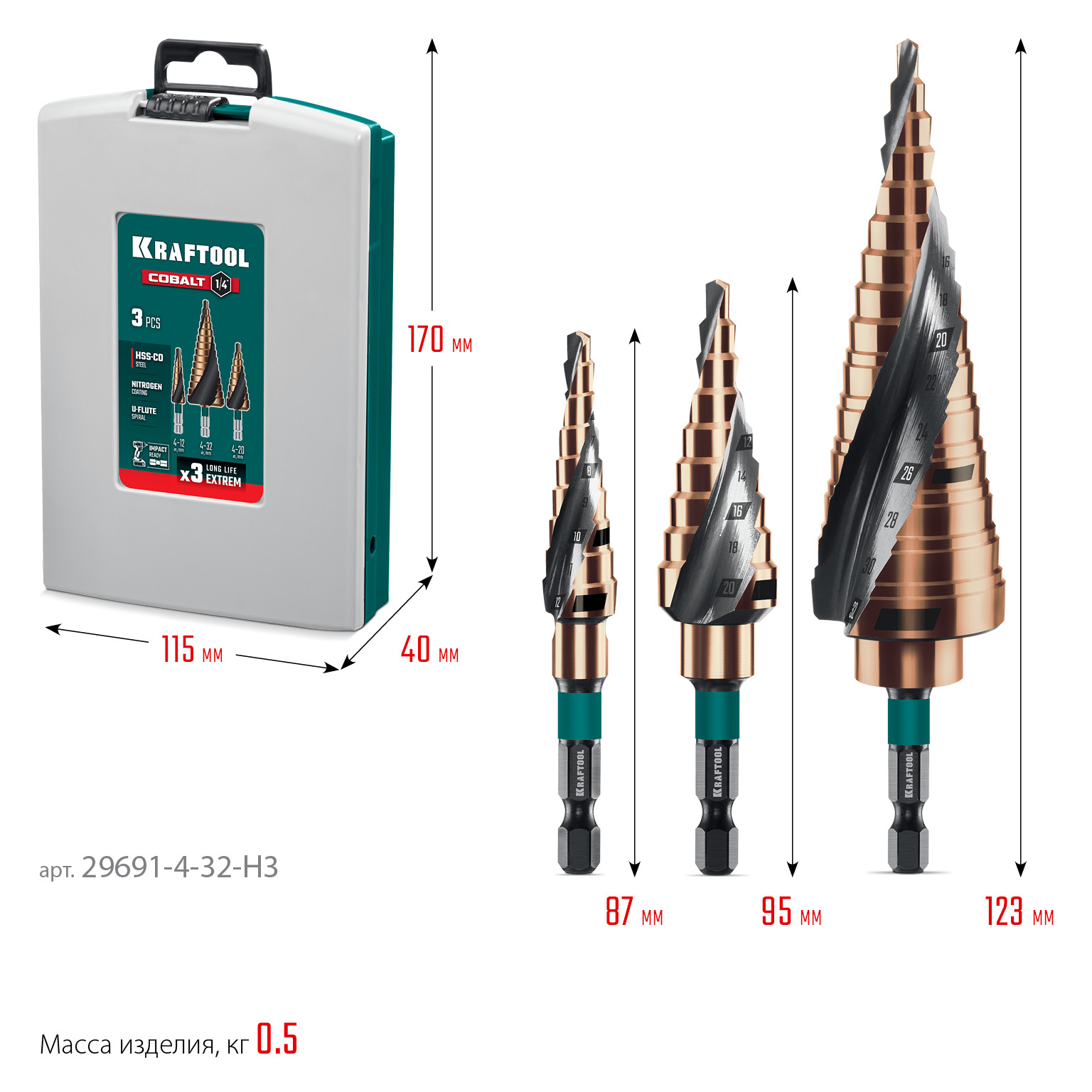 ПроизводителиНабор сверл ступенчатых 3шт.: 4-12, 4-20, 4-32мм., винт. спир., хвос. 1/4" (29691-4-32-H3) KRAFTOOL