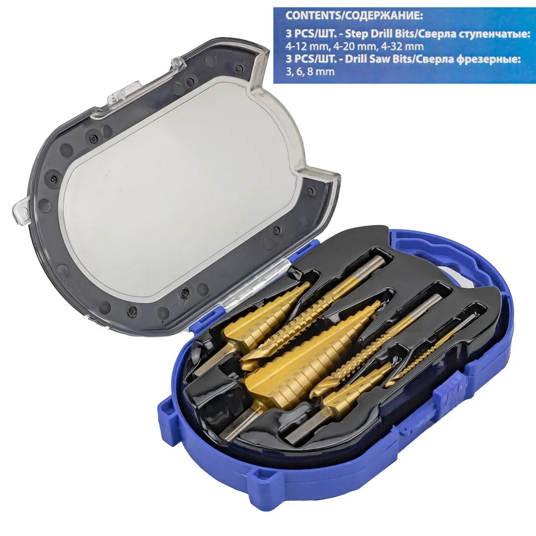 Набор сверл по металлу 6 предметов предназначен для получения отверстий различного диаметра без перестановки режущего инструмента в листовых и тонкостенных изделий из стали, цветных металлов, нержавеющей стали. В набор входят 3 супенчатых сверла и 3 фрезерных сверла. Принцип работы данного вида сверла прост: каждый следующий размер имеет плавный переход в виде ступеньки, что позволяет получать аккуратное отверстие нужного диаметра, не меняя при этом насадки. Используется для обработки очень тонкого листового металла и идеально подходит для обработки цветных металлов без деформации, а также применимо для работы с ПВХ, гипсокартоном, пластиком, древесными плитами. При больших объемах работ позволяет экономить время за счет отсутствия необходимости замены сверл различных диаметров.Производитель: Форсаж Лтд., Тайвань