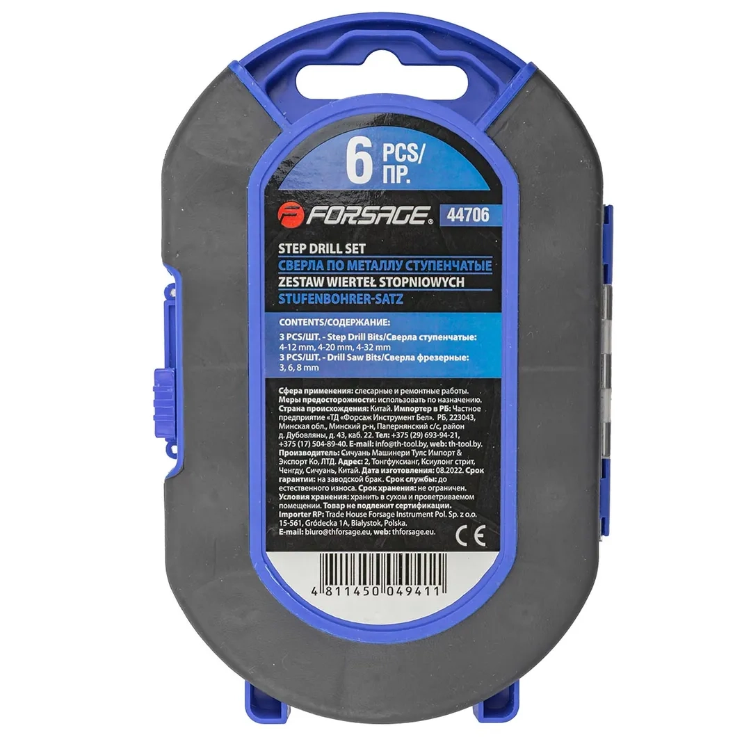 ПроизводителиНабор сверл ступенчатых и фрезерных 4-32 мм, 6 шт. (F-44706) FORSAGE
