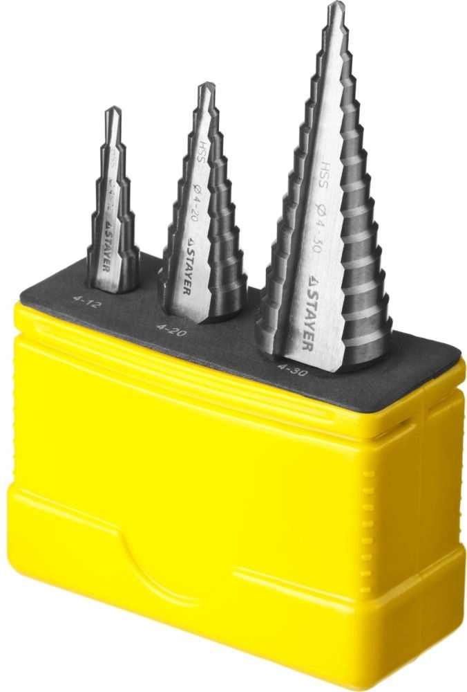 ПроизводителиНабор сверл по металлу ступенчатых 4-12, 4-20, 4-30 мм, HSS (29660-4-30-H3) STAYER