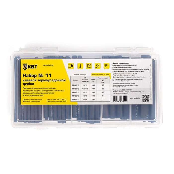 Набор № 11: Набор клеевой термоусадочной трубки, 103 шт., КВТ 85192 — набор из 5 наиболее востребованных типоразмеров термоусадочной трубки в практичном многоразовом органайзере с надежными замками и петлями. Предназначен для герметизации, изоляции и защиты от коррозии контактных соединений в электроэнергетике и телекоммуникациях.