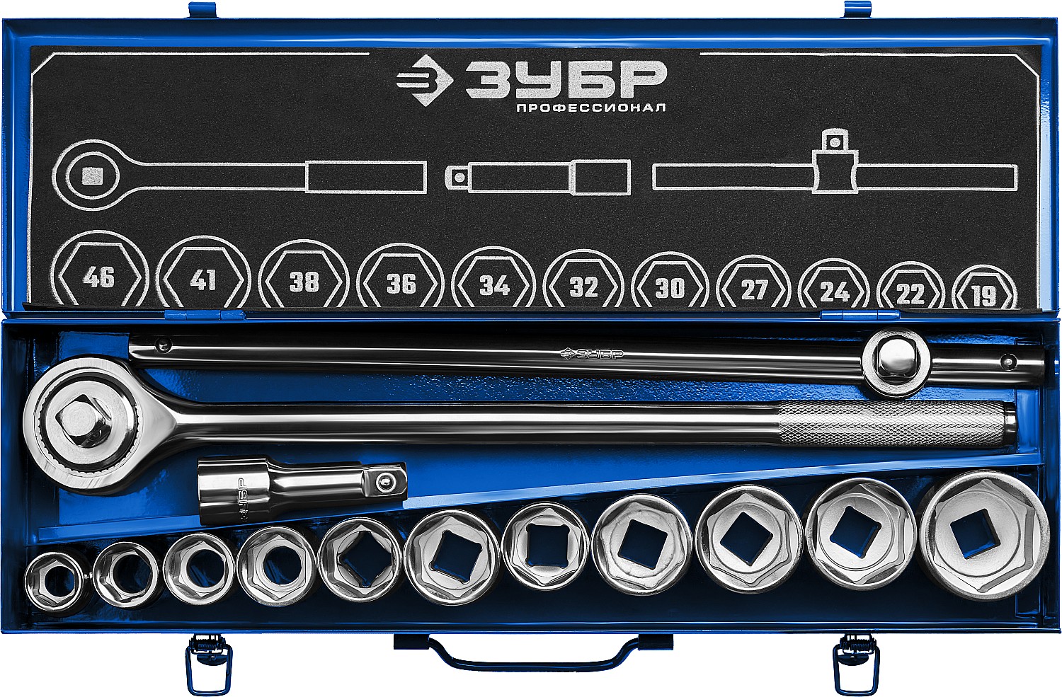 ПроизводителиНабор головок 3/4" 19-46мм, 14пр.., хромир., мет.чем "Профессионал" (27660-H14) ЗУБР