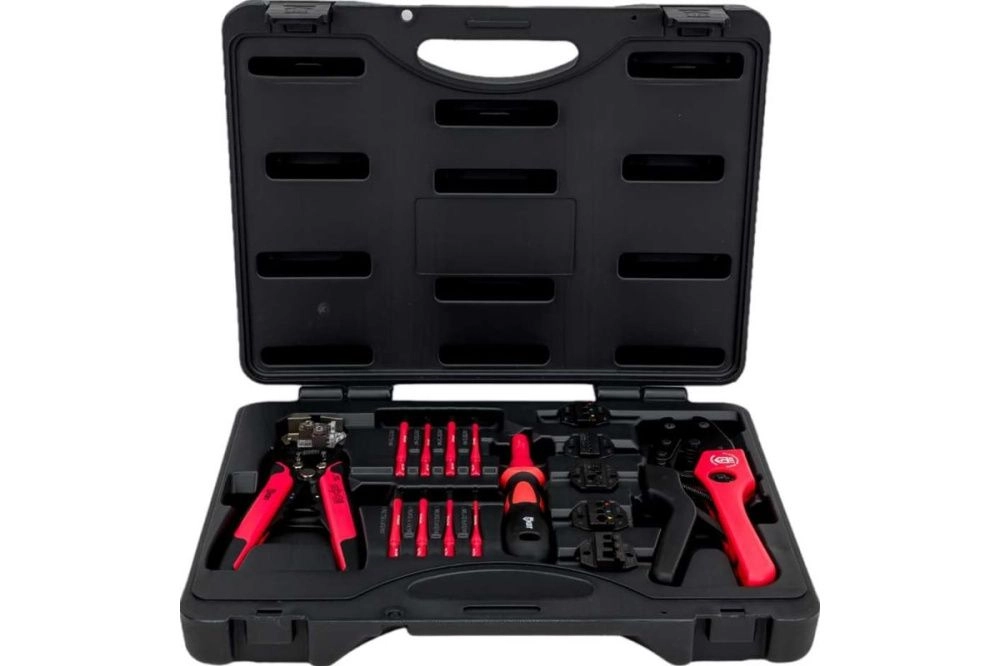 Состав набора: пресс-клещи СТК сменная матрица МПК-01 сменная матрица МПК-11 сменная матрица МПК-02 сменная матрица МПК-03 сменная матрица МПК-05 стриппер WS-07 диэлектрическая рукоятка для сменных бит диэлектрическая бита: шлиц 3.0х70 диэлектрическая бита СЛИМ: шлиц 4.0х70 диэлектрическая бита СЛИМ: шлиц 5.5х70 диэлектрическая бита СЛИМ: шлиц 6.0х70 диэлектрическая бита СЛИМ: PH1х70 диэлектрическая бита СЛИМ: PH2х70 диэлектрическая бита СЛИМ: PZ1х70 диэлектрическая бита СЛИМ: PZ2х70 пластиковый кейс