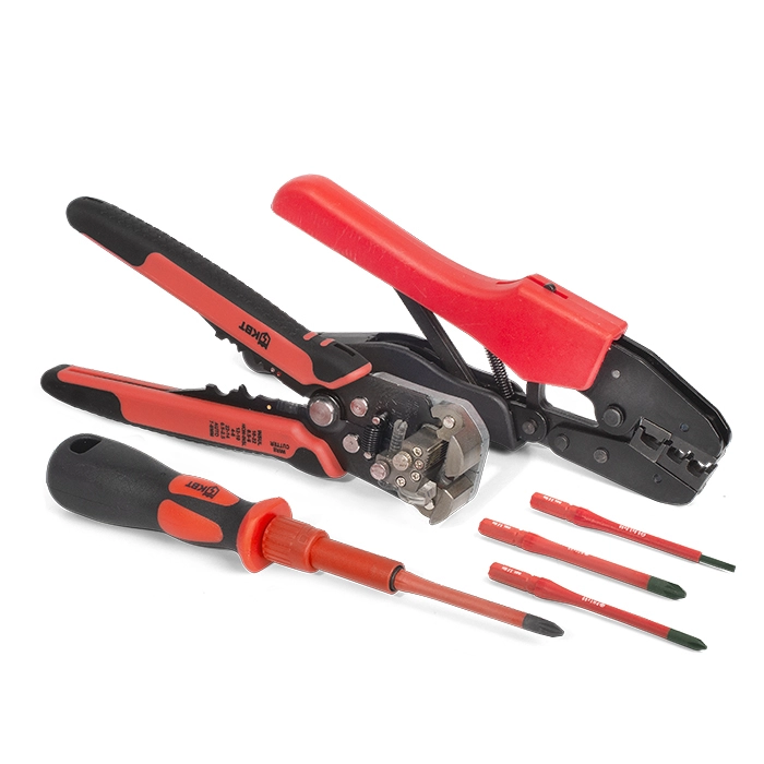Набор UNI Универсальный набор для резки, снятия изоляции, опрессовки и монтажа проводов с диэлектрическими битами серии «СЛИМ», КВТ 79758 — набор предназначен для резки и снятия изоляции с проводов до 10 мм, опрессовки изолированных, втулочных, неизолированных медных наконечников