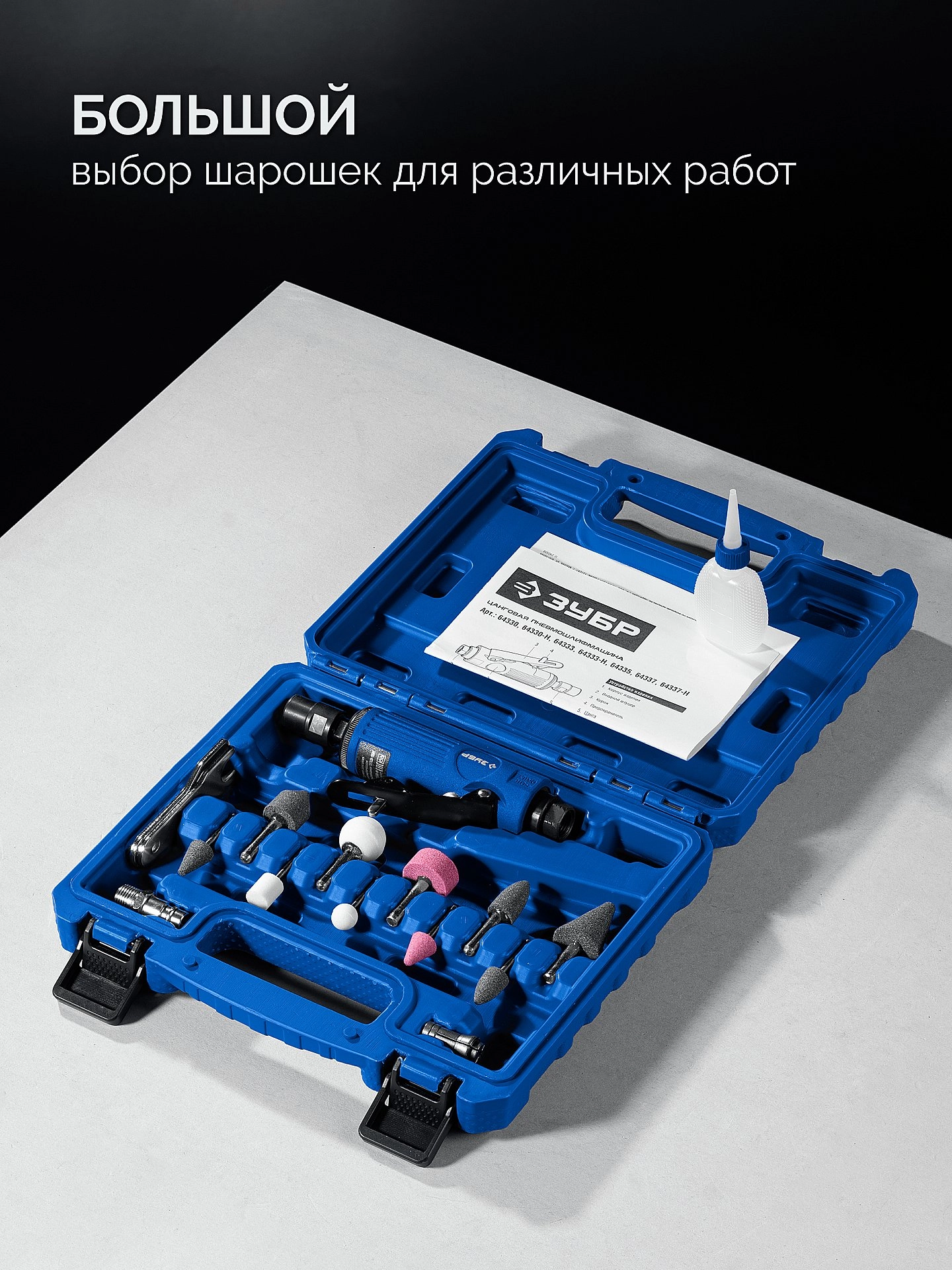 ПроизводителиНабор в кейсе: прямая цанговая пневмошлифмашина, 10 шарошек и оснастка, ПРОФЕССИОНАЛ (64330-H) ЗУБР