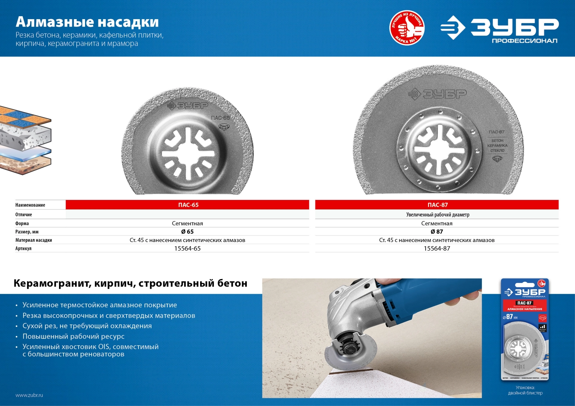 ПроизводителиНасадка пильная c алмазным напыл., сегментная, диаметр 87 мм, ПАС-65 "Профессионал" (15564-87) ЗУБР
