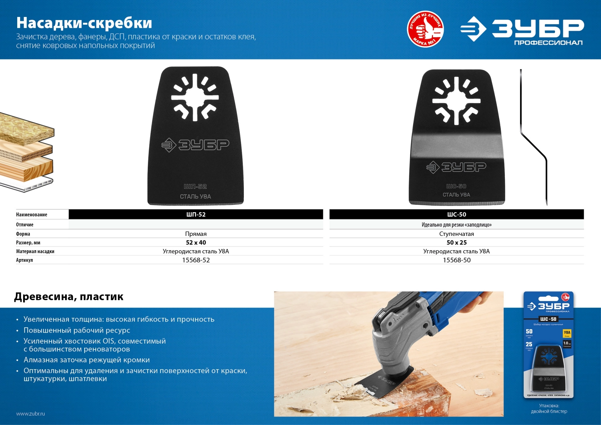 ПроизводителиНасадка шабер прямая, cталь У8А, 52 x 40 мм, ШП-52 "Профессионал" (15568-52) ЗУБР