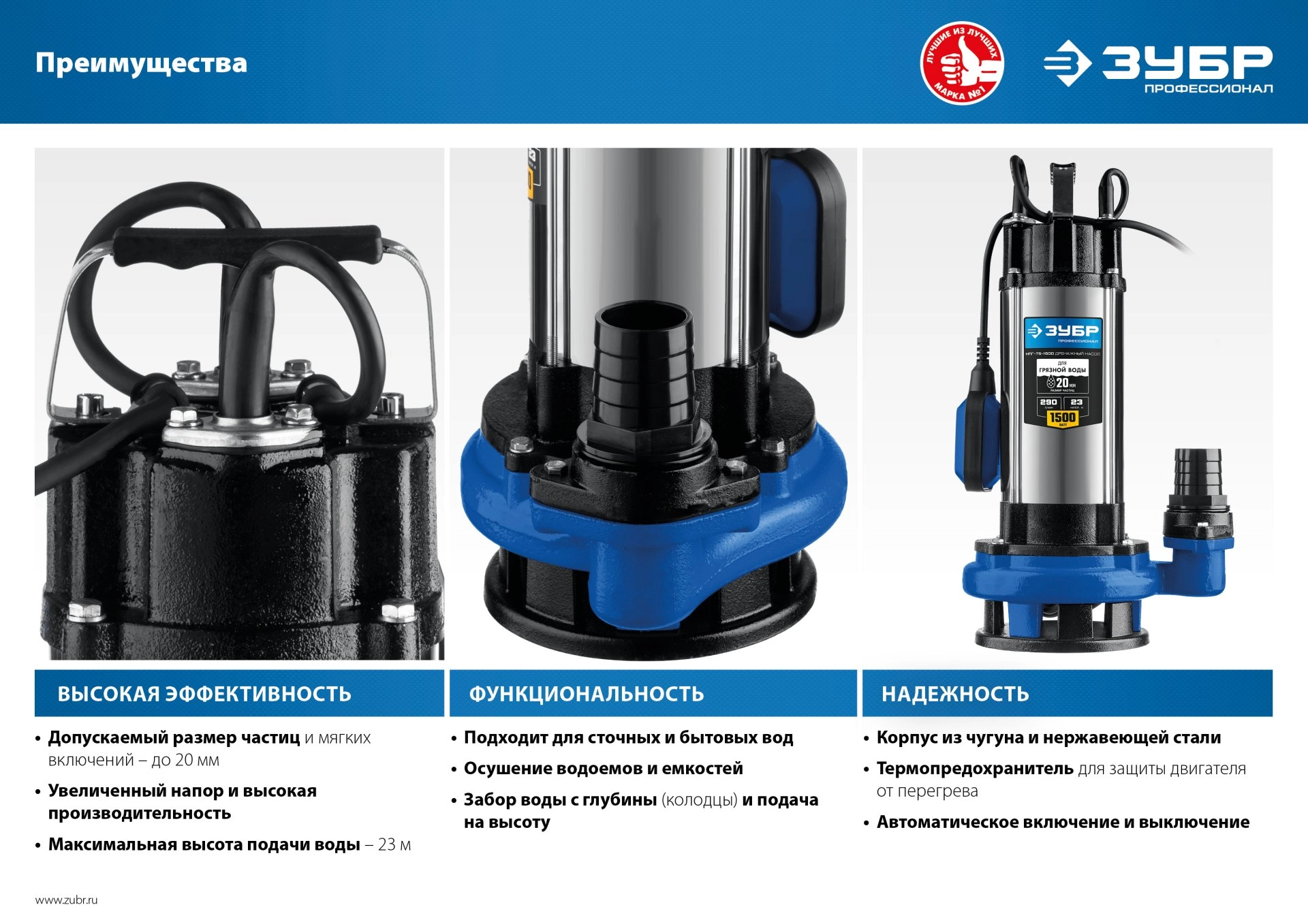 ПроизводителиНасос дренажный для грязной воды, 1500 Вт (НПГ-Т5-1500) ЗУБР
