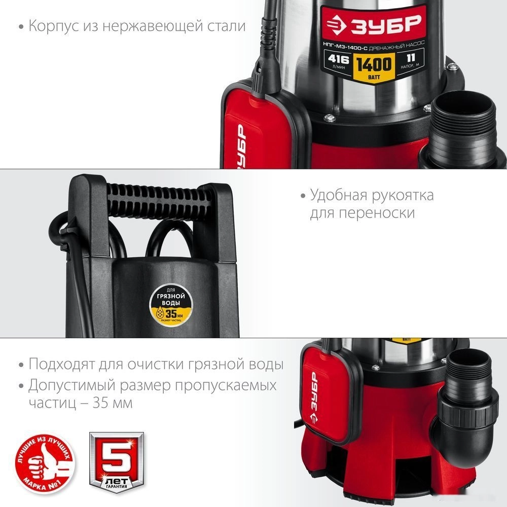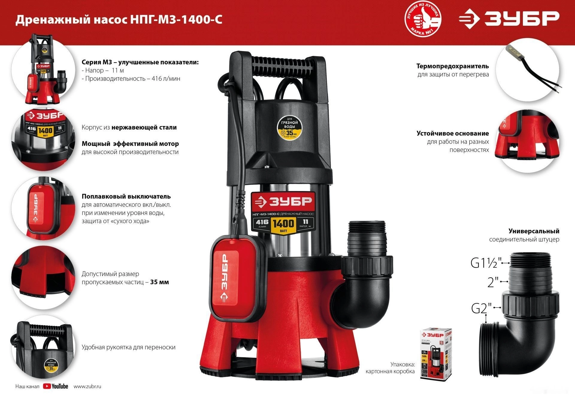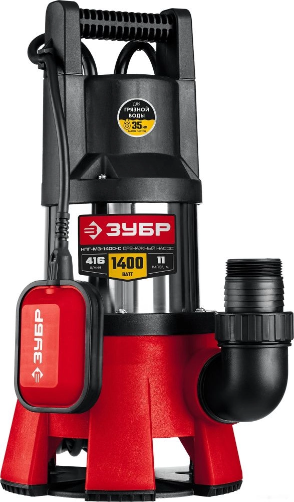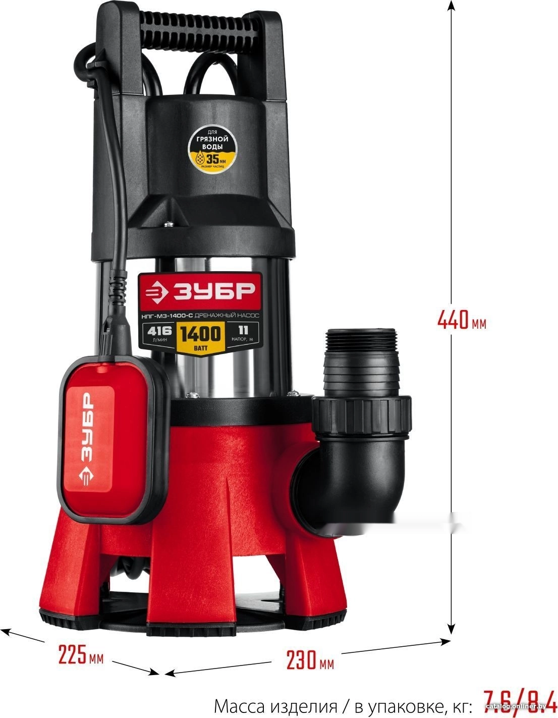 ПроизводителиНасос дренажный для грязной воды, корпус - нерж. сталь, 1400 Вт (НПГ-М3-1400-С) ЗУБР