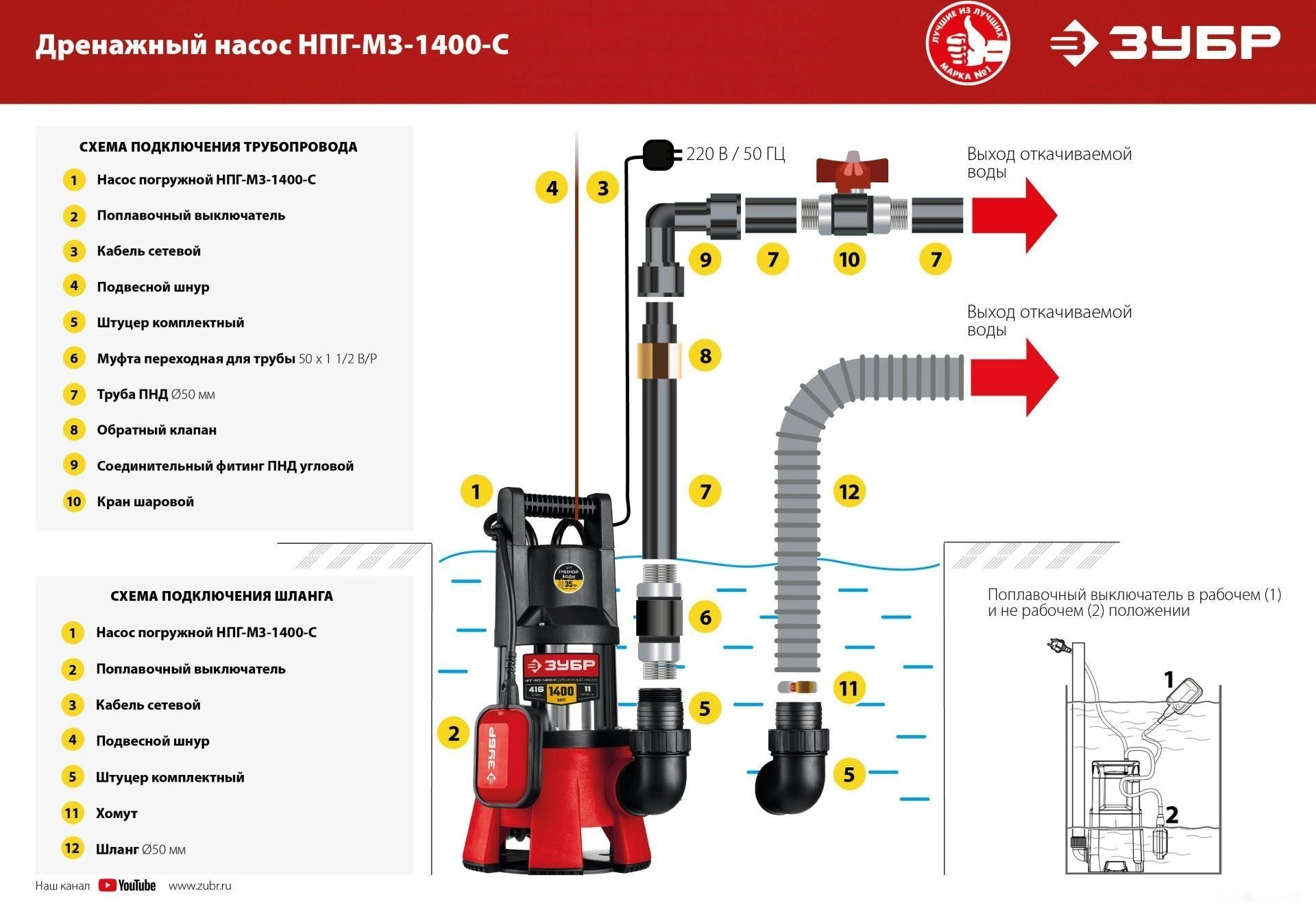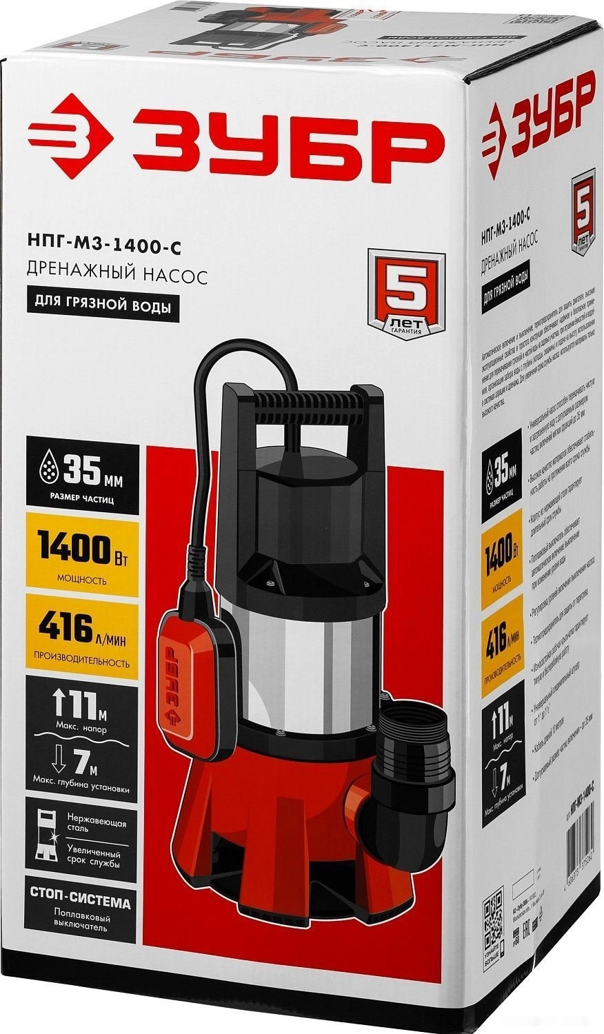 СТАНДАРТУровень качества. При классификации продуктов, имеющих схожее наименование, но обладающие различными потребительскими свойствами мы приняли следующий Вес факторов: 80% - подтвержденный ресурс, 15% - заявленная производительность/скорость, 5% - субъективные ощущения потребителя. ПодробнееКод товара: 0048238(0)ХарактеристикиАртикул НПГ-М3-1400-СБренды ЗубрСтрана производства КитайТип дренажныйПотребляемая мощность 1400Назначение водоотведениеПроизводительность 24.5Напряжение 220Глубина погружения 7Длина сетевого шнура 10Вес 7.6Метод установки погружнойНапор 11Размер пропускаемых частиц 35Длина 250Ширина 240Высота 500Длина кабеля 10Качество воды загрязненнаяОписание товара обновлено 08.12.2025 15:16:45Насос дренажный ЗУБР НПГ-М3-1400-С, предназначен для автоматического перекачивания загрязнённой воды из емкостей и водоемов, организации забора воды с колодцев, скважин и подачи на высоту. Высокое качество материалов и комплектующих гарантируют стабильность работы и длительный срок службы. Корпус из нержавеющей стали и высокое качество комплектующих гарантируют стабильность работы и длительный срок службы. Поплавковый выключатель обеспечивает автоматическое вкл/выкл при изменении уровня воды. Регулировка уровней вкл/выкл насоса. Термопредохранитель для защиты от перегрева. Износостойкая рабочая крыльчатка гарантирует тихую и бесперебойную работу. Универсальный соединительный штуцер от 1'' до 1 1/2''. Кабель длиной 10 м, который может использоваться даже на большой глубине. Допускаемый размер частиц включения - до 35 мм. КОМПЛЕКТАЦИЯ: