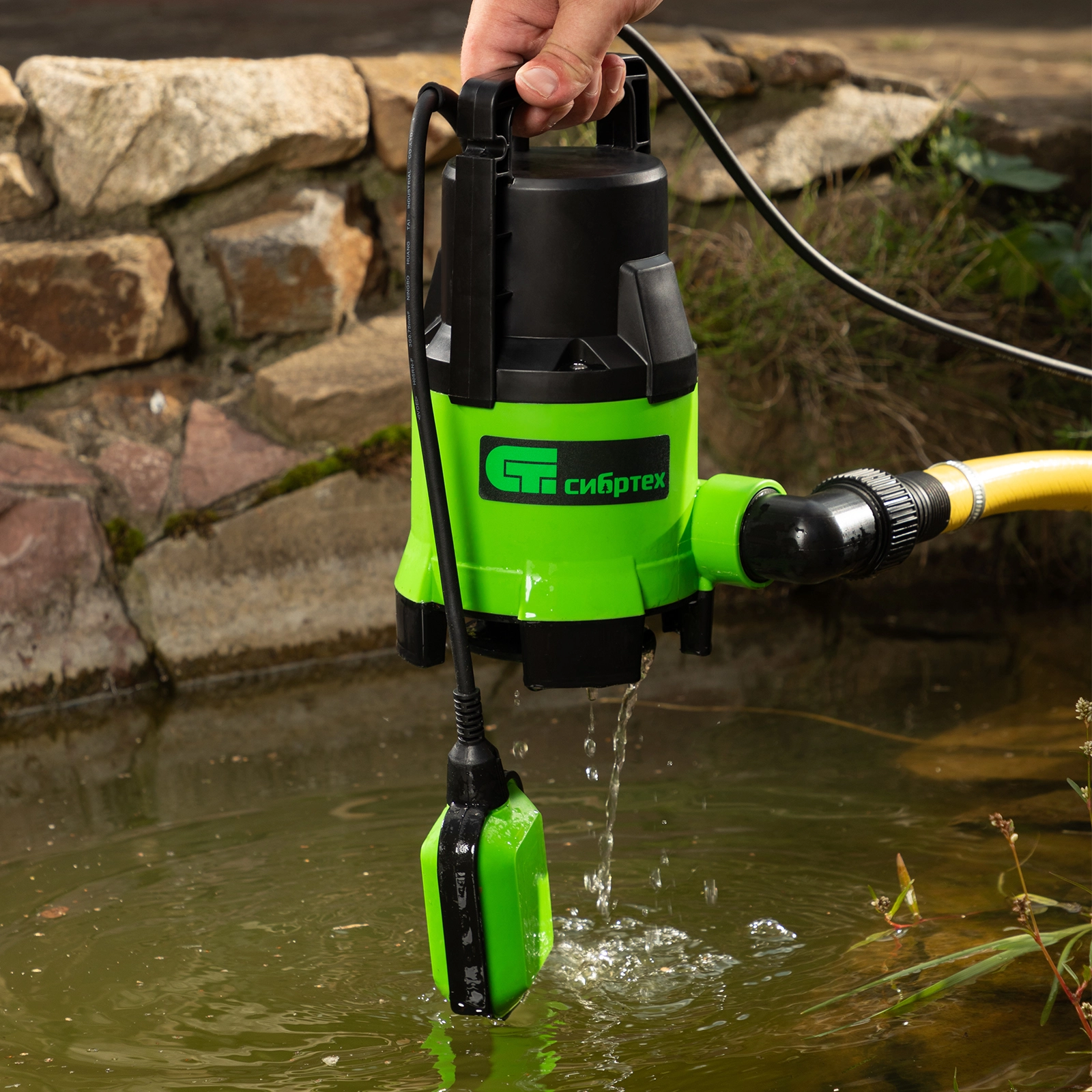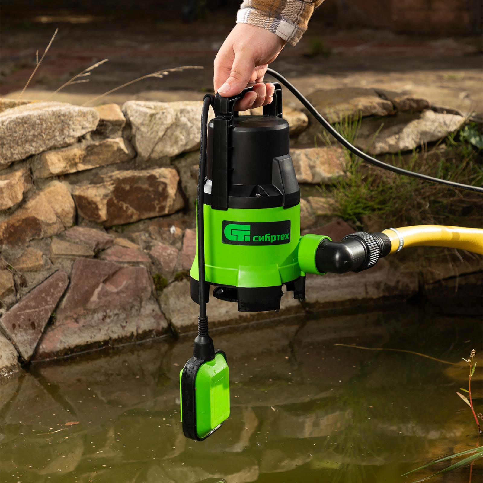 Правильная и удобная установка — к транспортировочной рукоятке можно привязать веревку для погружения и извлечения насоса.