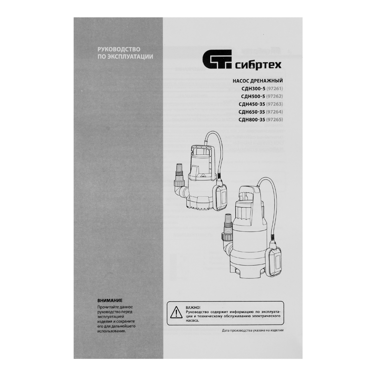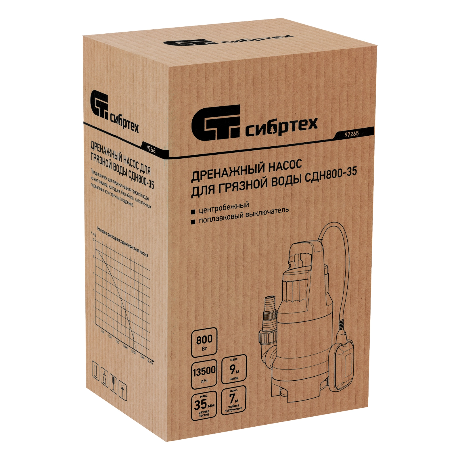 ПроизводителиНасос дренажный для грязной воды СДН800-35, 800 Вт, напор 9 м, 13500 л/ч Сибртех
