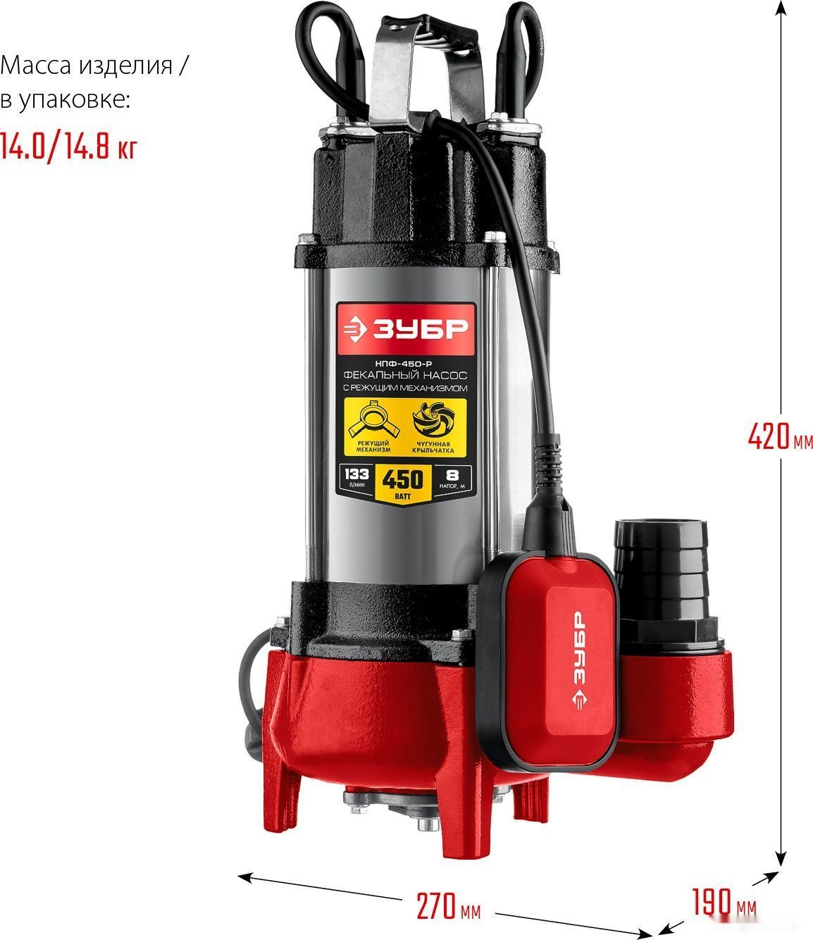 ХарактеристикиАртикул НПФ-450-РБренды ЗубрСтрана производства КитайТип фекальныйНазначение водоотведениеМатериал корпуса чугунПроизводительность 8Напряжение 220Глубина погружения 5Вес 14Метод установки погружнойНапор 8Длина 190Ширина 270Высота 420Длина кабеля 5Качество воды загрязненнаяОписание товара обновлено 08.12.2025 15:41:33Автоматическое поддержание давления, термопредохранитель для защиты двигателя, высокие эксплуатационными свойства и простая конструкция обеспечивают эффективное, надёжное и безопасное применение данных насосов для откачки грязной воды, сточных и бытовых вод на приусадебных и дачных хозяйствах.
