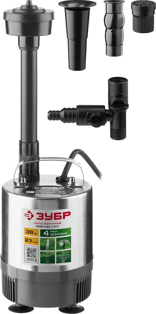 ПроизводителиНасос фонтанный, нерж. сталь, для чистой воды, напор 1,9 м (ЗНФЧ-23-1.9-C) ЗУБР