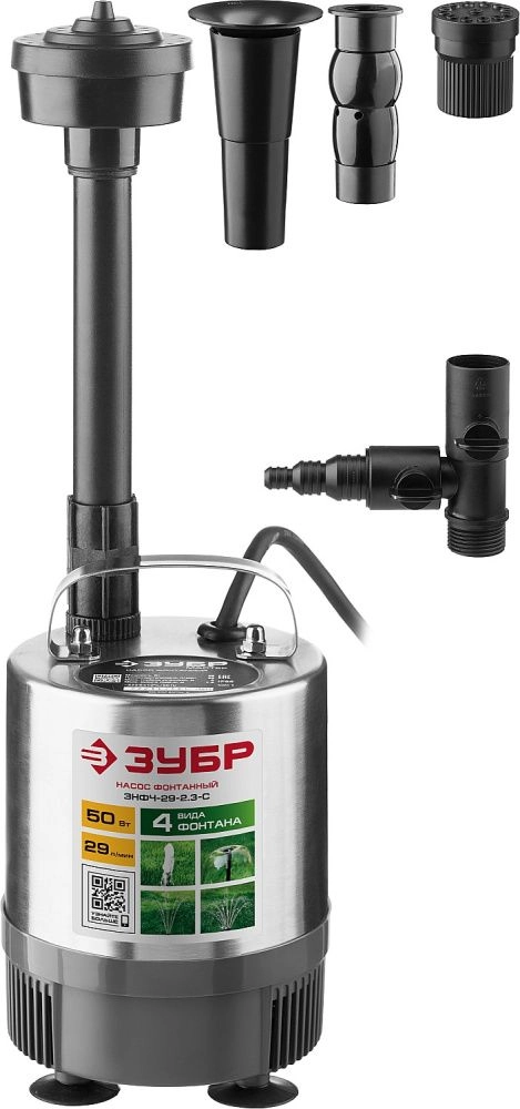 ПроизводителиНасос фонтанный, ЗУБР ЗНФЧ-29-2.3-C, нерж сталь, для чистой воды, напор 2,3 м, насадки: колокольчик,
