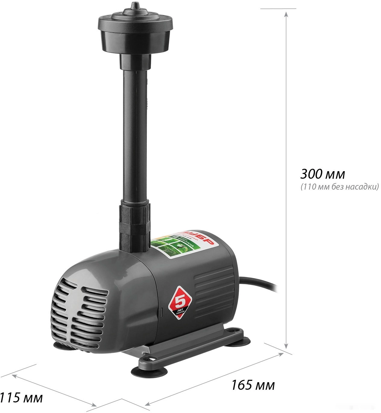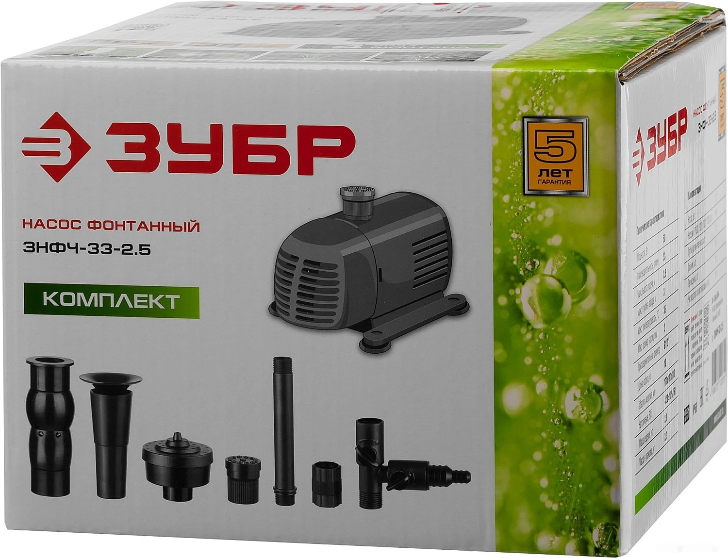 СТАНДАРТУровень качества. При классификации продуктов, имеющих схожее наименование, но обладающие различными потребительскими свойствами мы приняли следующий Вес факторов: 80% - подтвержденный ресурс, 15% - заявленная производительность/скорость, 5% - субъективные ощущения потребителя. ПодробнееКод товара: 0031706(0)Простое средство для украшения сада. Обычный пруд с установкой насоса превращается в фонтан, причем, благодаря сменным насадкам, форма струи легко меняется между "гейзером", "каскадом" и "колокольчиком", а также может переключаться на водопад. Таким образом, одно изделие способно изменить Ваш пруд или сад, привнеся в него веселое и успокаивающее журчание воды, под которое так приятно отдыхать после рабочей неделиХарактеристикиАртикул ЗНФЧ-33-2.5Бренды ЗубрСтрана производства КитайТип фонтанныйПотребляемая мощность 50Назначение водоснабжениеМатериал корпуса пластикПроизводительность 1.98Напряжение 220Глубина погружения 3Длина сетевого шнура 10Вес 2Метод установки погружнойНапор 2.5Размер пропускаемых частиц 2Длина 165Ширина 115Высота 300Длина кабеля 10Качество воды чистаяОписание товара обновлено 08.12.2025 15:15:52Простое средство для украшения сада. Обычный пруд с установкой насоса превращается в фонтан, причем, благодаря сменным насадкам, форма струи легко меняется между "гейзером", "каскадом" и "колокольчиком", а также может переключаться на водопад.