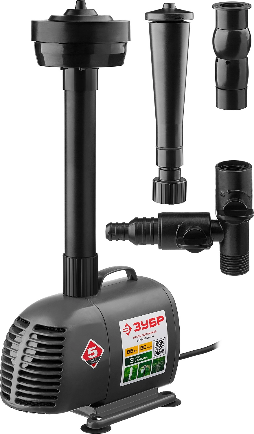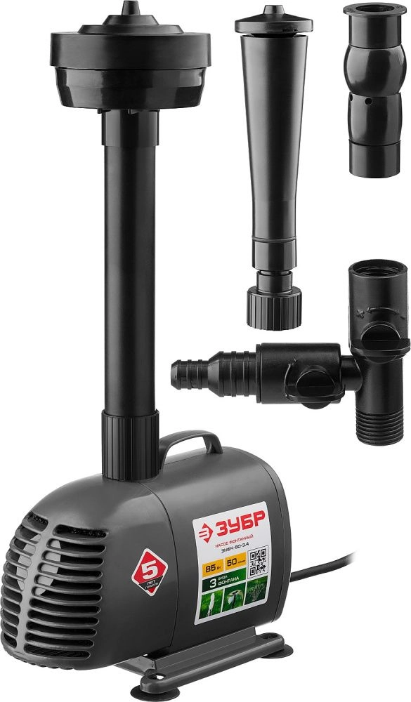 ПроизводителиНасос фонтанный, ЗУБР ЗНФЧ-50-3.4, для чистой воды, напор 3,4 м, насадки: колокольчик, гейзер, каска