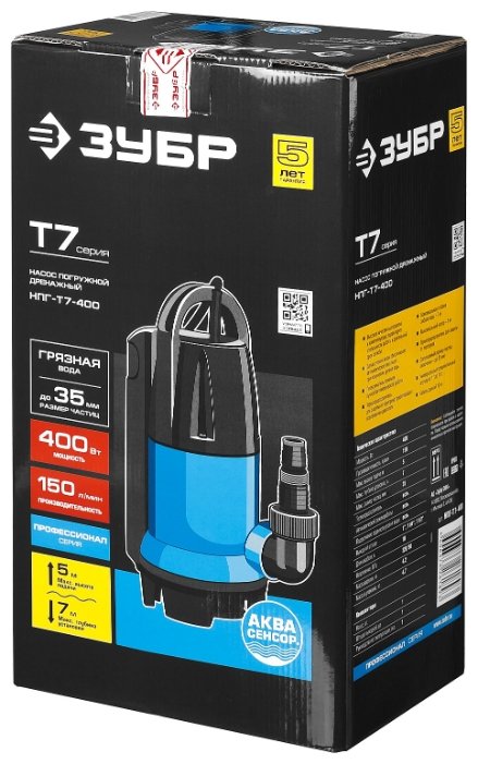 ПРОФИУровень качества. При классификации продуктов, имеющих схожее наименование, но обладающие различными потребительскими свойствами мы приняли следующий Вес факторов: 80% - подтвержденный ресурс, 15% - заявленная производительность/скорость, 5% - субъективные ощущения потребителя. ПодробнееАвтоматическое включение и выключение, термопредохранитель для защиты двигателя, высокие эксплуатационные свойства и простота конструкции обеспечивают надёжное и безопасное применение для перекачивания чистой воды на садовых участках, при осушении ёмкостей и водоёмов, организации забора воды с глубины (колодцы, скважины) и подачи на высоту, использовании в системах аэрации и дренажа. Для увеличения срока службы насоса используются материалы только высокого качества. При помощи этого насоса вы без труда решите поставленную задачу.ХарактеристикиАртикул НПГ-Т7-400Бренды ЗубрСтрана производства КитайТип дренажныйПотребляемая мощность 400Назначение водоснабжениеЦвет черный/синийМатериал корпуса пластикПроизводительность 9Напряжение 220Глубина погружения 7Длина сетевого шнура 10Защита от перегрева ДаВес 4.2Максимальный напор 5Метод установки погружнойФорма вертикальныйНапор 5Размер пропускаемых частиц 35Длина 22Ширина 16Высота 39Длина кабеля 10Качество воды чистаяМаксимальный остаточный уровень воды 35Автоматическое включение/выключение ДаГлубина выключения 135Максимальная температура перекачиваемой воды 35Класс защиты IЗащита от сухого хода ДаТип погружного насоса дренажныйТип насоса электрическийРезьба внешняяПоддержание заданного уровня воды ДаПрисоединительная резьба 1, 1 1/2, 1 1/4Ручка для переноски ДаОписание товара обновлено 08.12.2025 15:17:22Автоматическое включение и выключение, термопредохранитель для защиты двигателя, высокие эксплуатационные свойства и простота конструкции обеспечивают надёжное и безопасное применение для перекачивания чистой воды на садовых участках, при осушении ёмкостей и водоёмов, организации забора воды с глубины (колодцы, скважины) и подачи на высоту, использовании в системах аэрации и дренажа.