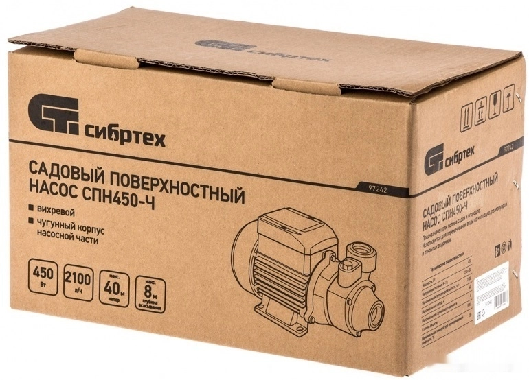 ПроизводителиНасос садовый поверхностный СПН450-Ч, 450 Вт, напор 40 м, 2100 л/ч, чугун (97242) СИБРТЕХ