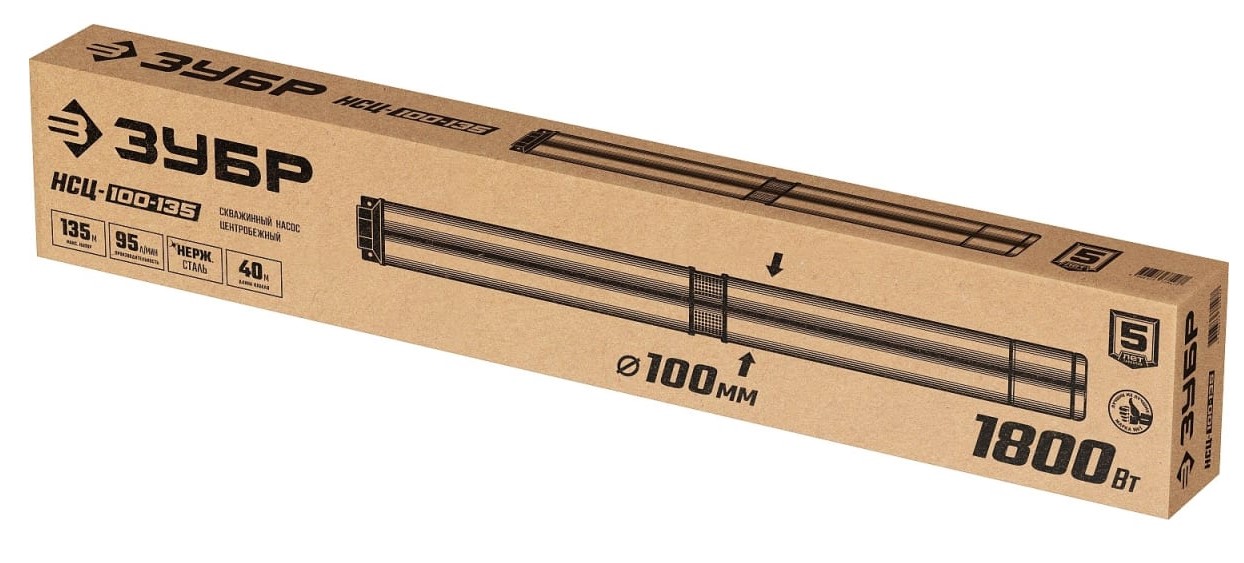 ХарактеристикиАртикул НСЦ-100-135Бренды ЗубрСтрана производства КитайТип скважинныйПотребляемая мощность 1800Назначение водоснабжениеЦвет серебристыйМатериал корпуса нержавеющая стальТип двигателя электрическийГлубина погружения 70Длина сетевого шнура 40Вес 22.9Максимальный напор 135Метод установки погружнойФорма вертикальныйРазмер пропускаемых частиц 2Диаметр скважины 7Длина кабеля 40Класс защиты IP68Максимальная температура воды 35Вид насоса по типу забора воды нормально всасывающийТип питания электродвигателя от сетиОписание товара обновлено 08.12.2025 15:27:21Эффективное и простое решение для организации подачи воды в дом и для организации полива в саду